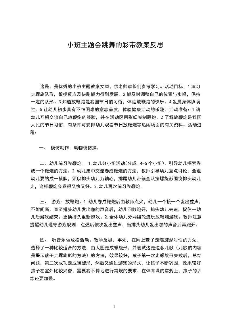 这是,是优秀的小班主题教案文章,供老师家长们参考学习。活动目标:1练习走螺旋队形,敏捷反应及快跑能力得到发展。2能及时调整自己的位置与步幅,保持一定的队形。3知道放鞭炮是我国节日的习俗,体验放鞭炮的快乐。4发展身体协调性。5让幼儿初步具有不怕困难的意志品质,体验健康活动的乐趣。活动准备:1请幼儿互相交流自己放鞭炮的经验,并在活动区用彩纸卷制鞭炮。2了解放鞭炮是我国人民的节日习俗,有条件可安排幼儿观看节日放鞭炮等热闹场面的有关资料。活动过程: