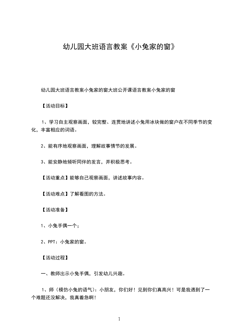 幼儿园大班语言教案小兔家的窗大班公开课语言教案小兔家的窗