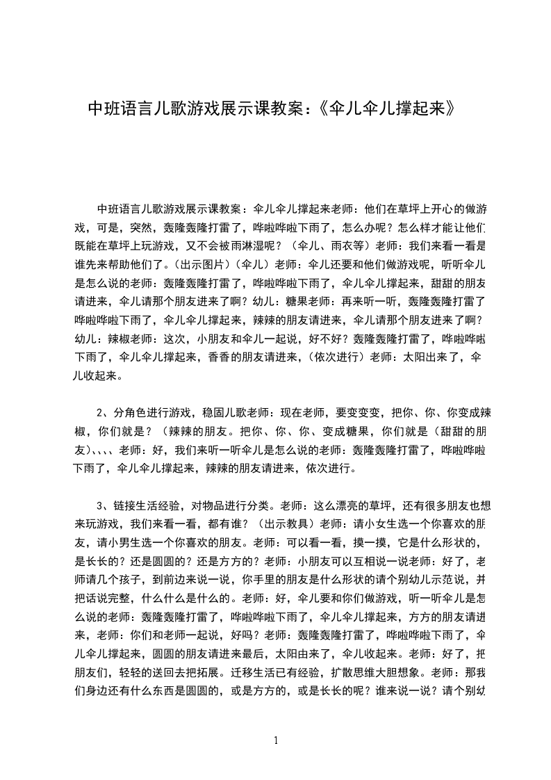 中班语言儿歌游戏展示课教案:伞儿伞儿撑起来老师:他们在草坪上开心的做游戏,可是,突然,轰隆轰隆打雷了,哗啦哗啦下雨了,怎么办呢?怎么样才能让他们既能在草坪上玩游戏,又不会被雨淋湿呢?(伞儿、雨衣等)老师:我们来看一看是谁先来帮助他们了。(出示图片)(伞儿)老师:伞儿还要和他们做游戏呢,听听伞儿是怎么说的老师:轰隆轰隆打雷了,哗啦哗啦下雨了,伞儿伞儿撑起来,甜甜的朋友请进来,伞儿请那个朋友进来了啊?幼儿:糖果老师:再来听一听,轰隆轰隆打雷了,哗啦哗啦下雨了,伞儿伞儿撑起来,辣辣的朋友请进来,伞儿请那个朋友进来了啊?幼儿:辣椒老师:这次,小朋友和伞儿一起说,好不好?轰隆轰隆打雷了,哗啦哗啦下雨了,伞儿伞儿撑起来,香香的朋友请进来,(依次进行)老师:太阳出来了,伞儿收起来。