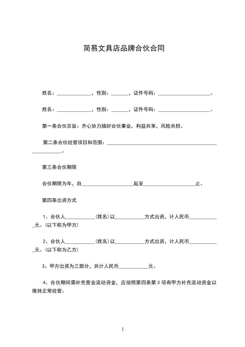 1、合伙人____________(姓名)以____________方式出资,计人民币____________元。(以下称为甲方)
