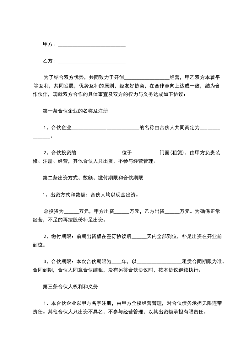 1、本合伙企业以甲方名字注册,由甲方全权经营管理,对合伙债务承担无限连带责任。其他合伙人只出资不具名,不参与经营管理,以其出资额承担有限责任。