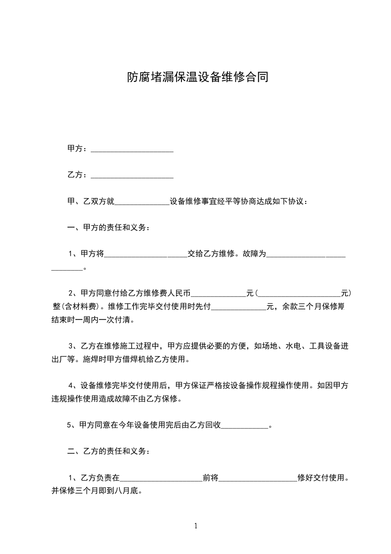 1、甲方将_____________________交给乙方维修。故障为____________________________。