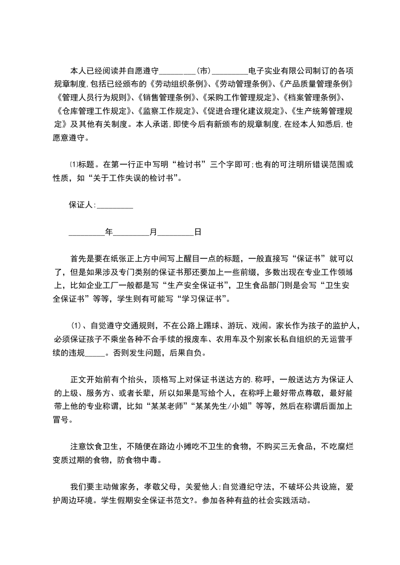 本人已经阅读并自愿遵守_________(市)_________电子实业有限公司制订的各项规章制度,包括已经颁布的《劳动组织条例》、《劳动管理条例》、《产品质量管理条例》、《管理人员行为规则》、《销售管理条例》、《采购工作管理规定》、《档案管理条例》、《仓库管理工作规定》、《监察工作规定》、《促进合理化建议规定》、《生产统筹管理规定》及其他有关制度。本人承诺,即使今后有新颁布的规章制度,在经本人知悉后,也愿意遵守。
