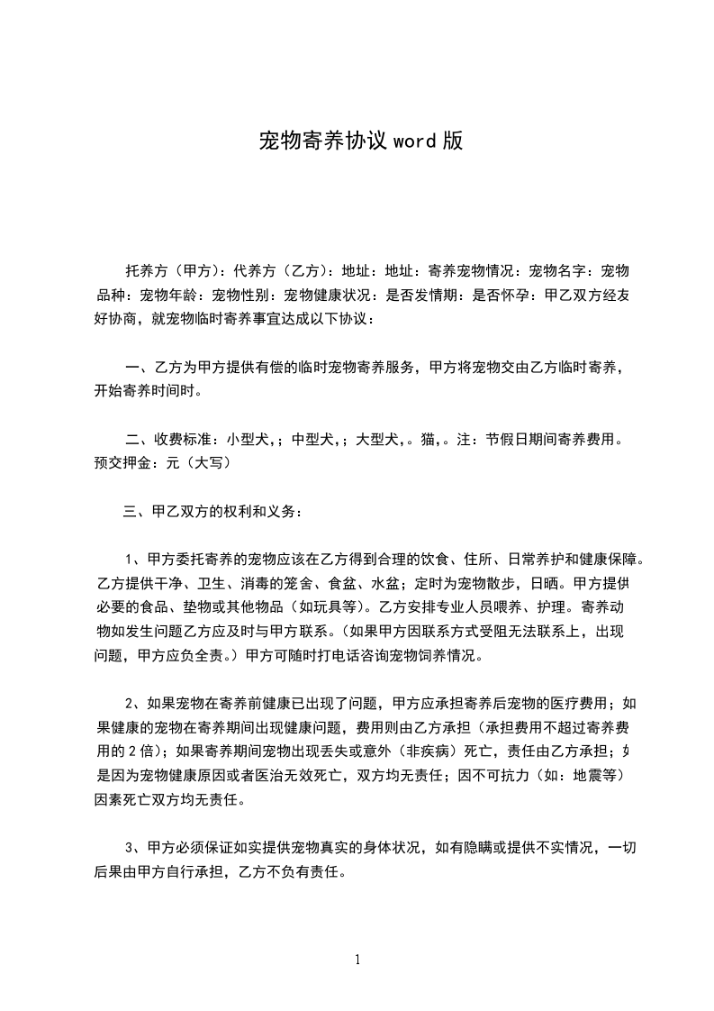 宠物主人姓名:电话号码:地址:宠物姓名:品种:年龄:疫苗注射情况:宠物饮食习惯:备注:宠物寄养时间:年月日至年月日(预定)收费标准:时间天数:其他费用:合计金额:寄养有利于为您的宠物提供及时良好的宠物托管服务,并为您的外出或事业带来很多方便。为了进一步搞好寄养工作,请您仔细阅读本院有关规定,若同意请在寄养协议尾签字。具体规定如下: