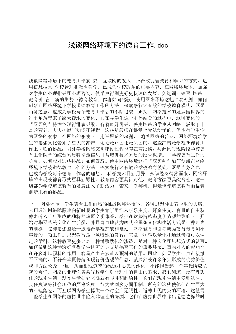 浅谈网络环境下的德育工作摘 要:互联网的发展,正在改变着教育和学习的方式,运用信息技术 学校管理和教育教学,已成为学校改革的重要内容。在网络环境下,加强对学生的心理指导和心理咨询,使学生得到更好更快速的发展。关键词:德育 网络 教育引 言:新的形势下德育教育工作者如何驾驭、使用网络环境这把“双刃剑”如何创新在网络环境下学校道德教育工作的方法,探索条行之有效的学校德育模式,既是当务之急,也成为学校每个德育工作者的不断追求。正文:网络技术的发展给世界的每个角落带来了翻天覆地的变化。而在与学生这一主体结合的过程中。这种变化的“双刃剑”特性体现得淋漓尽致。有着良好引导、善用网络的学生从网络上汲取了丰富的营养,大大扩展了知识和视野,这些是教师在课堂上无法给予的。但也有学生沦为网络的奴隶,在网络的驱使下,走进黑暗的深渊。 随着网络的普及,网络环境给学生的思想文化带来了更大的冲击,无论是正面还是负面的。这些冲击是学校在德育工作上面临的挑战,另外学校网络文明建设过程也存在着缺陷,与此同时现阶段学校德育工作队伍的综台素质特别是信息日常培训技术素质的缺失也增加了学校德育工作的难度。如何应对这些挑战?如何驾驭、使用网络环境这把“双刃剑”如何创新在网络环境下学校道德教育工作的方法,探索条行之有效的学校德育模式,既是当务之急,也成为学校每个德育工作者的理想。 科学技术日新月异,知识经济悄然而来。网络环境的出现使德育形式更具新颖性、教育内容更具针对性、教育方法更具综台性,这一切都为学校道德教育的发展注入了新活力,带来了新契机。但是也使道德教育面临着前所未有的挑战。