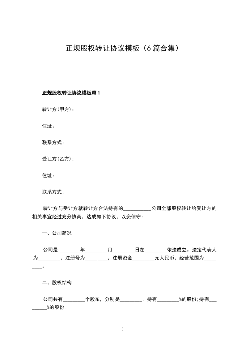 正规股权转让协议模板篇1