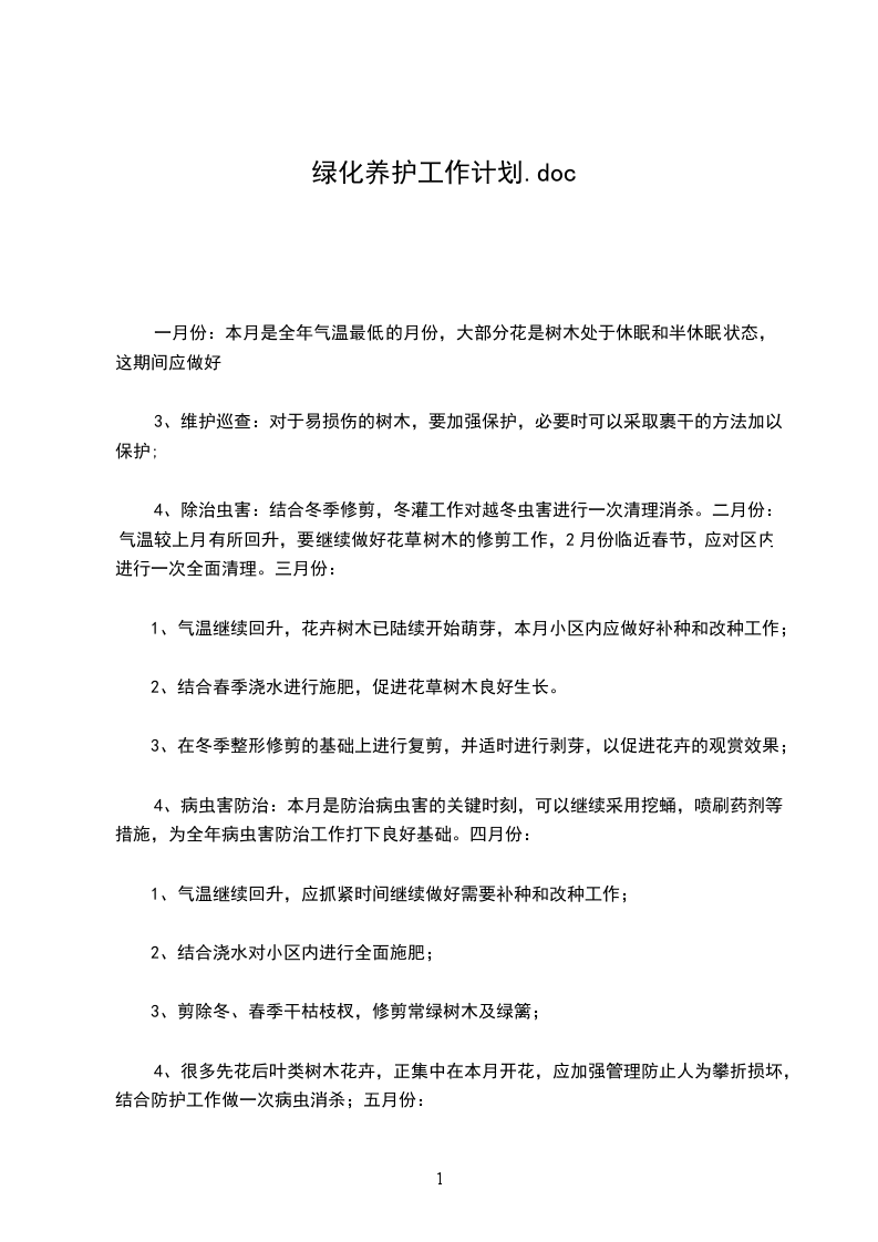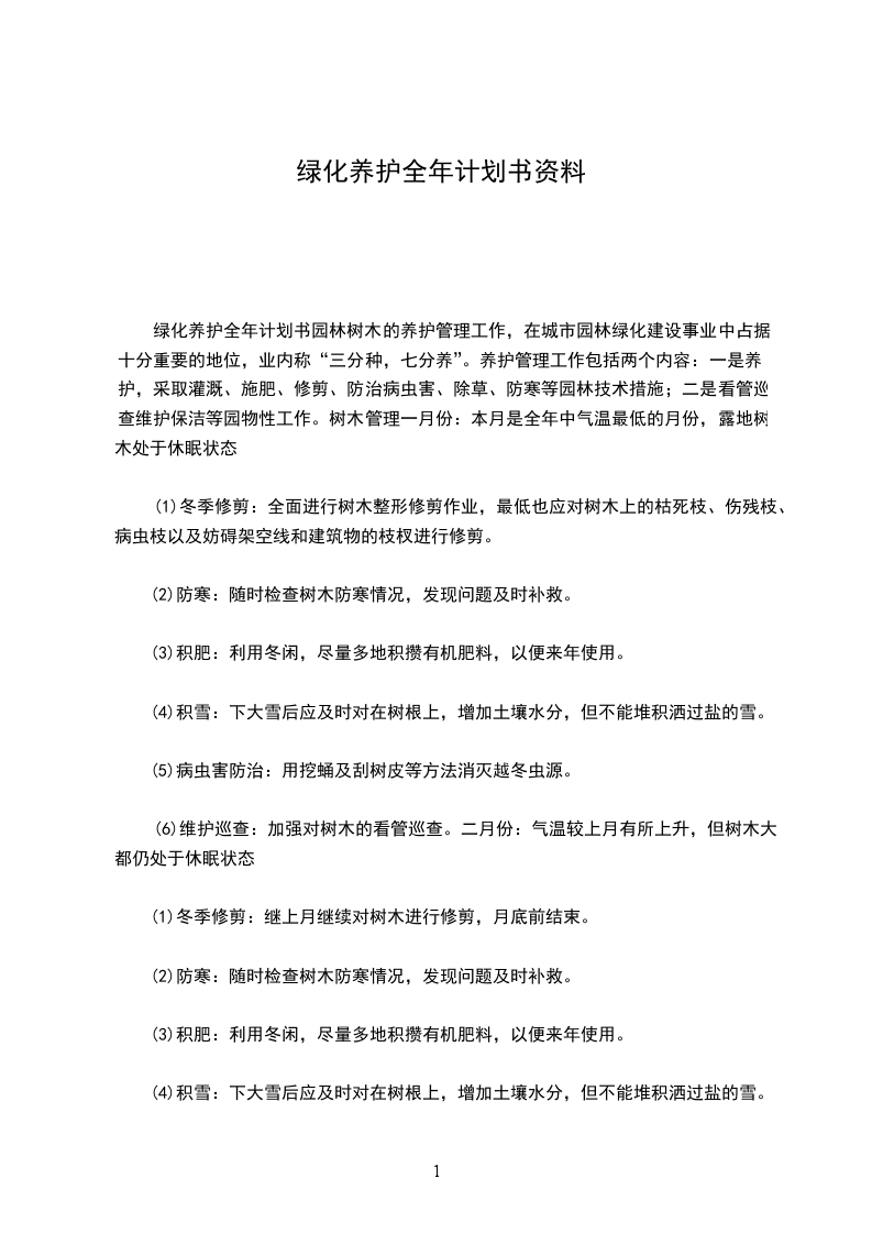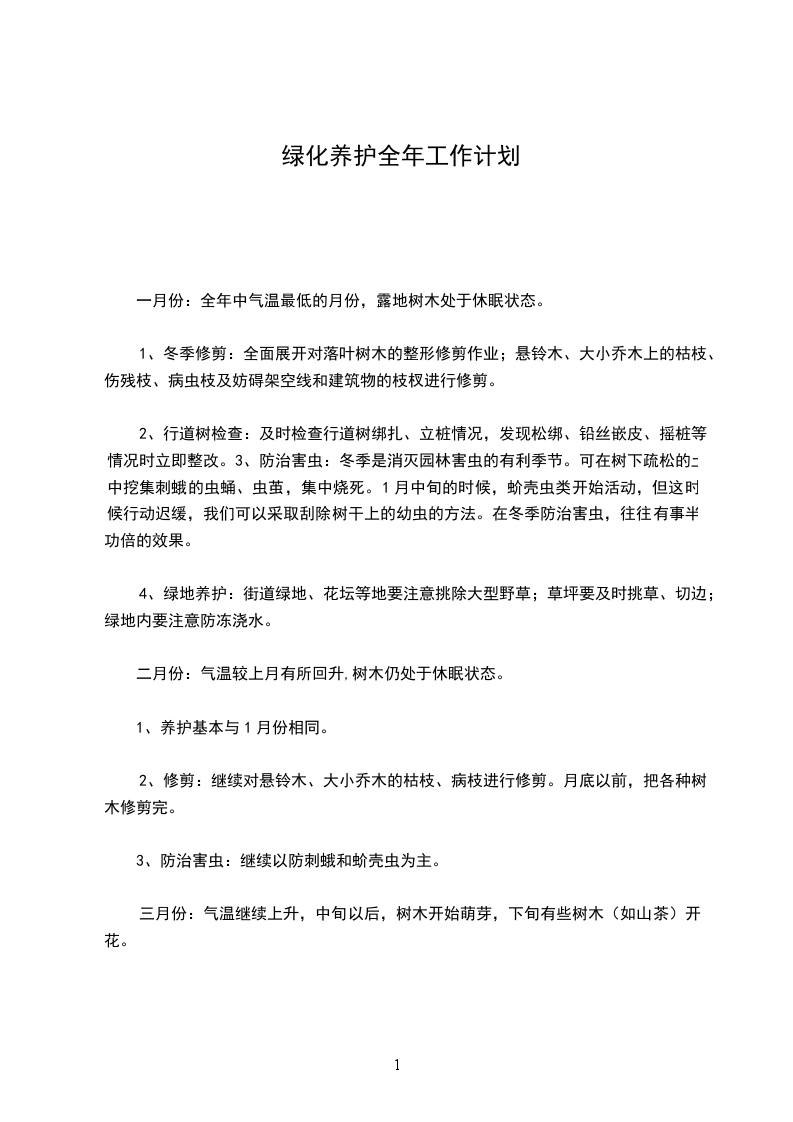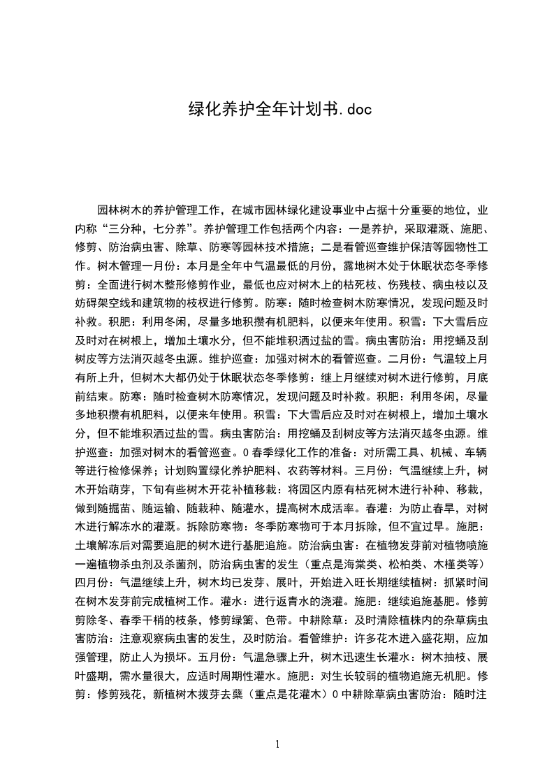 欢迎阅读园林树木的养护管理工作,在城市园林绿化建设事业中占据十分重要的地位,业内称“三分种,七分养”。养护管理工作包括两个内容:一是养护,采取灌溉、施肥、修剪、防治病虫害、除草、防寒等园林技术措施;二是看管巡查维护保洁等园物性工作。树木管理.I.一月份:本月是全年中气温最低的月份,露地树木处于休眠状态II小J
