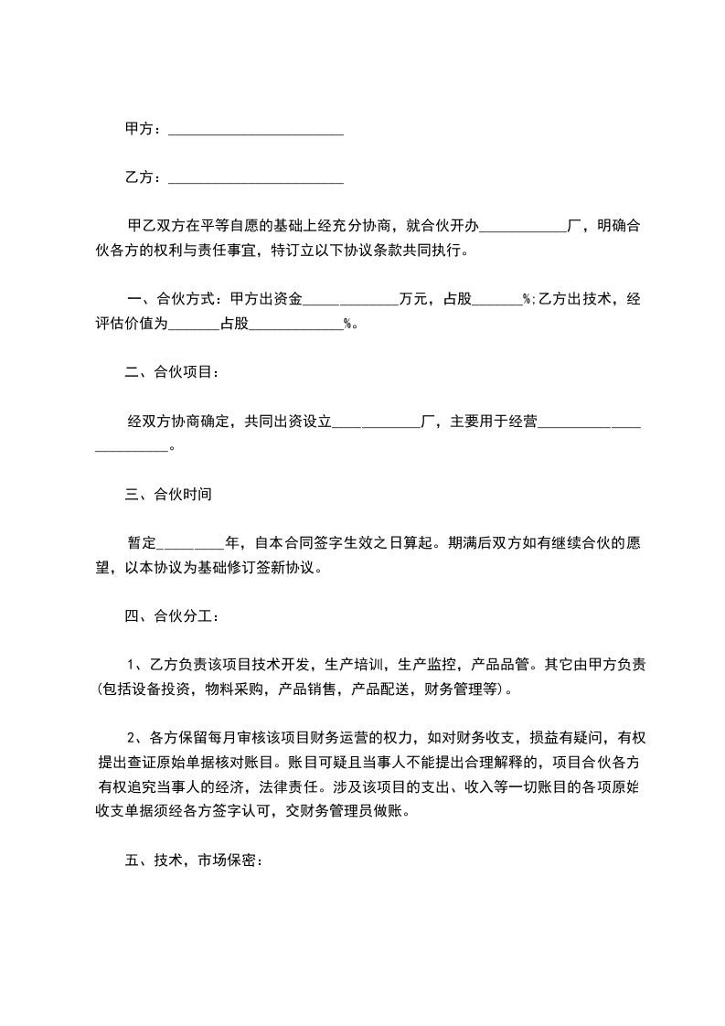一、合伙方式:甲方出资金_____________万元,占股_______%;乙方出技术,经评估价值为_______占股_____________%。