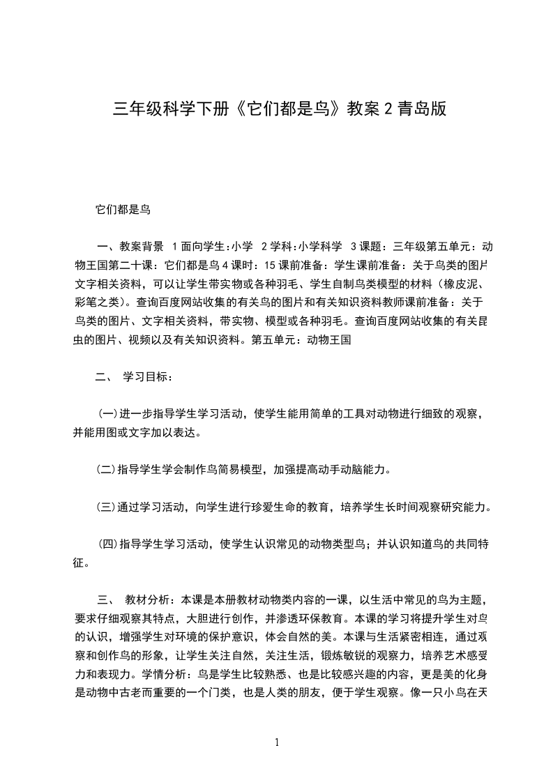 一、 教案背景1面向学生:小学2学科:小学科学3课题:三年级第五单元:动物王国第二十课:它们都是鸟4课时:15课前准备:学生课前准备:关于鸟类的图片、文字相关资料,可以让学生带实物或各种羽毛、学生自制鸟类模型的材料(橡皮泥、彩笔之类)。查询百度网站收集的有关鸟的图片和有关知识资料教师课前准备:关于鸟类的图片、文字相关资料,带实物、模型或各种羽毛。查询百度网站收集的有关昆虫的图片、视频以及有关知识资料。第五单元:动物王国
