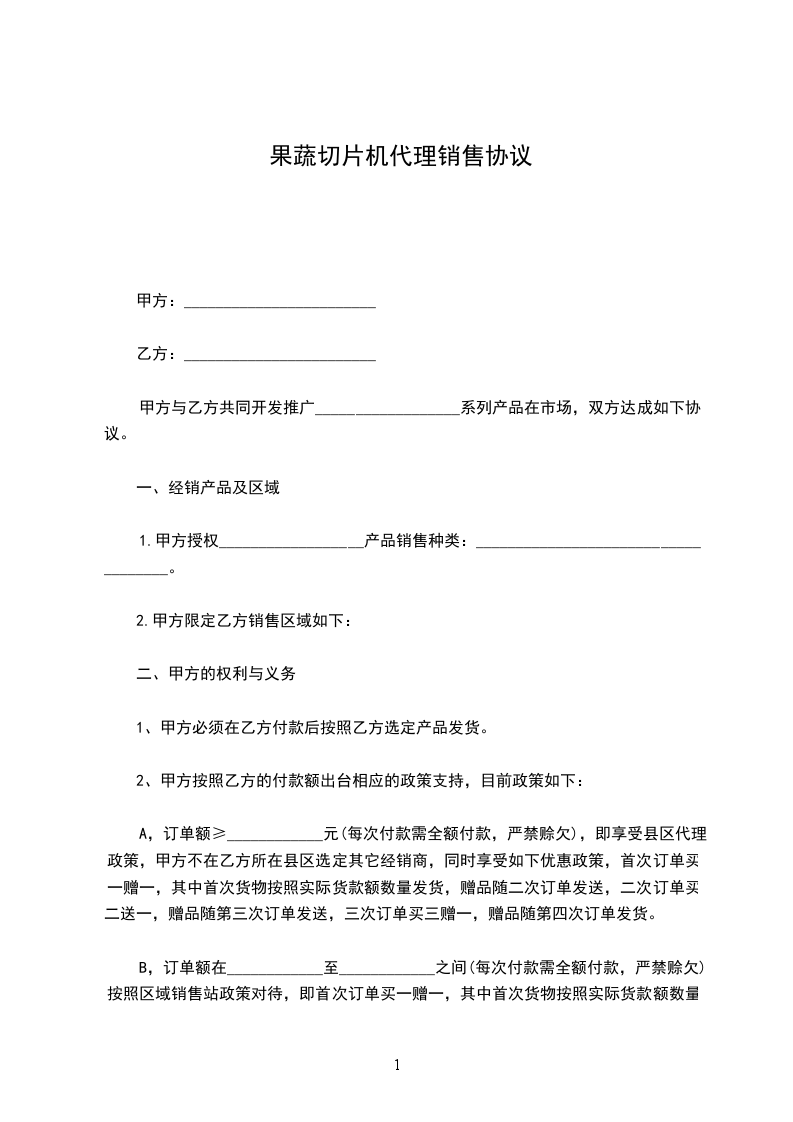 B,订单额在____________至____________之间(每次付款需全额付款,严禁赊欠)按照区域销售站政策对待,即首次订单买一赠一,其中首次货物按照实际货款额数量发货,赠品随二次订单发送,二次订单买二送一,赠品随第三次订单发送,三次订单买三赠一,赠品随第四次订单发货。甲方可以在乙方所在县区建立新的销售站。