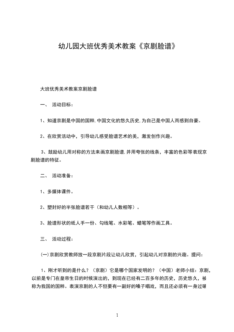 (一)京剧欣赏教师放一段京剧片段让幼儿欣赏,引起幼儿对京剧的兴趣。提问: