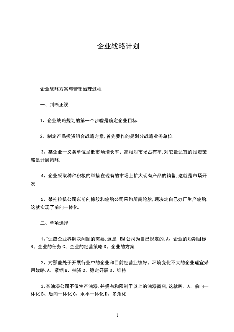 1、“适应企业界解决问题的需要,这是BM公司为自己规定的.A、企业的短期目标B、企业的任务C、企业的经营策略D、企业的方案