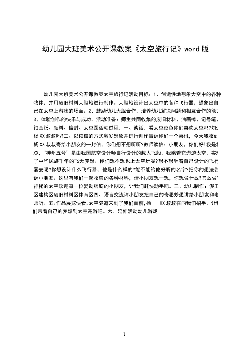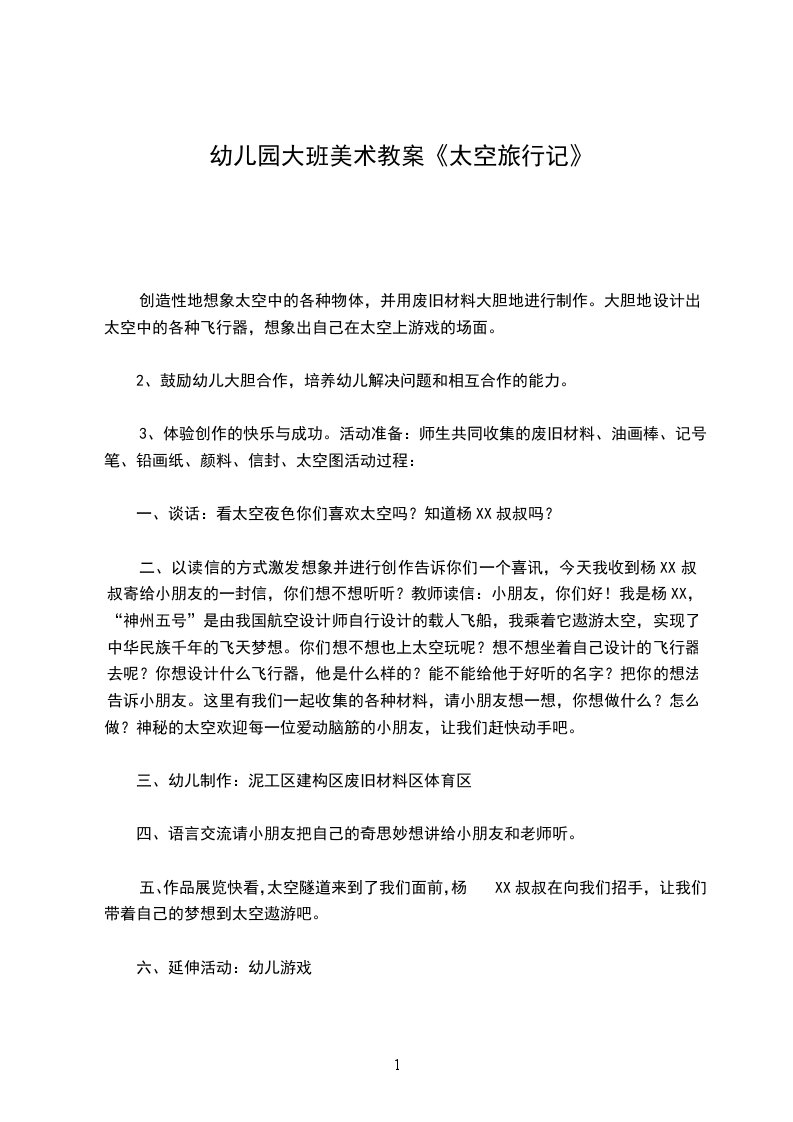 二、以读信的方式激发想象并进行创作告诉你们一个喜讯,今天我收到杨XX叔叔寄给小朋友的一封信,你们想不想听听?教师读信:小朋友,你们好!我是杨XX,“神州五号”是由我国航空设计师自行设计的载人飞船,我乘着它遨游太空,实现了中华民族千年的飞天梦想。你们想不想也上太空玩呢?想不想坐着自己设计的飞行器去呢?你想设计什么飞行器,他是什么样的?能不能给他于好听的名字?把你的想法告诉小朋友。这里有我们一起收集的各种材料,请小朋友想一想,你想做什么?怎么做?神秘的太空欢迎每一位爱动脑筋的小朋友,让我们赶快动手吧。