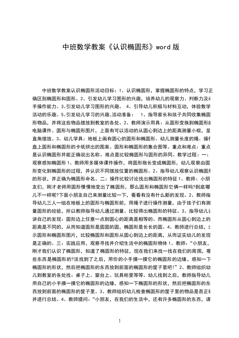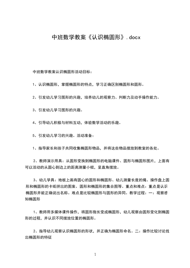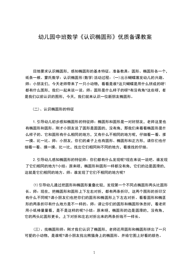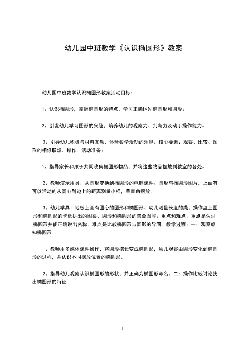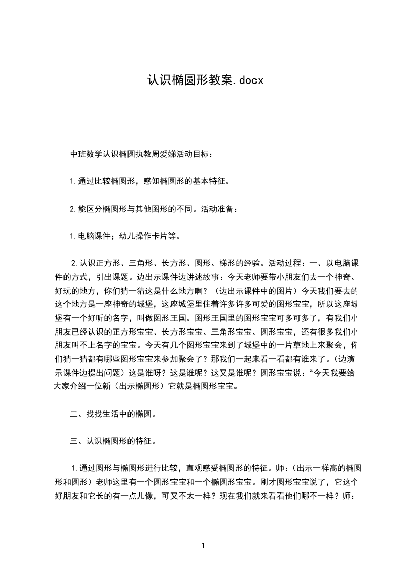 (一)导入部分1.观察感知椭圆形。教师把圆形变成椭圆形,幼儿观察由圆形变成椭圆形的过程。2指导幼儿观察认识椭圆形的形状特征。