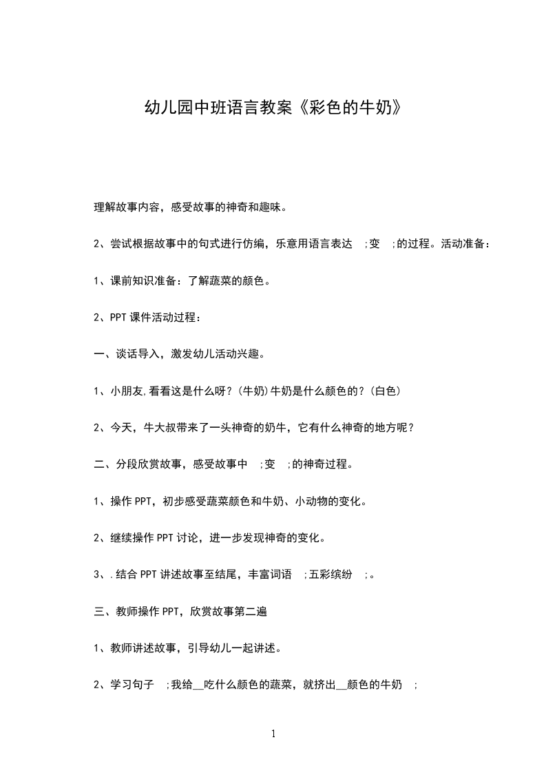 1、小朋友,看看这是什么呀?(牛奶)牛奶是什么颜色的?(白色)
