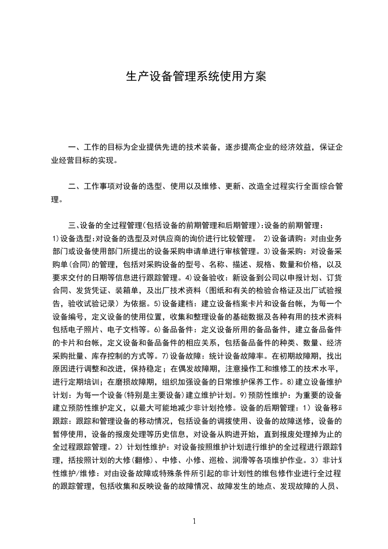 三、设备的全过程管理(包括设备的前期管理和后期管理):设备的前期管理:1)设备选型:对设备的选型及对供应商的询价进行比较管理。2)设备请购:对由业务部门或设备使用部门所提出的设备采购申请单进行审核管理。3)设备采购:对设备采购单(合同)的管理,包括对采购设备的型号、名称、描述、规格、数量和价格,以及要求交付的日期等信息进行跟踪管理。4)设备验收:新设备到公司以申报计划、订货合同、发货凭证、装箱单,及出厂技术资料(图纸和有关的检验合格证及出厂试验报告,验收试验记录)为依据。5)设备建档:建立设备档案卡片和设备台帐,为每一个设备编号,定义设备的使用位置,收集和整理设备的基础数据及各种有用的技术资料,包括电子照片、电子文档等。6)备品备件:定义设备所用的备品备件,建立备品备件的卡片和台帐,定义设备和备品备件的相应关系,包括备品备件的种类、数量、经济采购批量、库存控制的方式等。7)设备故障:统计设备故障率。在初期故障期,找出原因进行调整和改进,保持稳定;在偶发故障期,注意操作工和维修工的技术水平,进行定期培训;在磨损故障期,组织加强设备的日常维护保养工作。8)建立设备维护计划:为每一个设备(特别是主要设备)建立维护计划。9)预防性维护:为重要的设备建立预防性维护定义,以最大可能地减少非计划抢修。设备的后期管理:1)设备移动跟踪:跟踪和管理设备的移动情况,包括设备的调拨使用、设备的故障送修,设备的暂停使用,设备的报废处理等历史信息,对设备从购进开始,直到报废处理掉为止的全过程跟踪管理。2)计划性维护:对设备按照维护计划进行维护的全过程进行跟踪管理,括按照计划的大修(翻修)、中修、小修、巡检、润滑等各项维护作业。3)非计划性维护/维修:对由设备故障或特殊条件所引起的非计划性的维包修作业进行全过程的跟踪管理,包括收集和反映设备的故障情况、故障发生的地点、发现故障的人员、维修的过程、调换的备件等信息进行跟踪管理。4)紧急抢修:建立一个快速的反应机制,对设备的紧急抢修过程进行跟踪管理,同时着重于反馈的方便性、灵活性,由能够满足于管理的严密性。5)设备故障跟踪分析:对设备的故障历史进行跟踪、反馈、统计和分析,通过分析和改进,以提高设备的完好率,减少设备故障对生产的影响,降低设备维护/维修的成本。6)备品备件采购管理:按照经济采购批量和最低库存量,根据实际使用量控制采购量。对使用部门提出的采购需求(如请购单)进行分析后,建立采购单。对采购单进行全过程的跟踪管理,直到采购物品全部收到并通过验收为止。7)备品备件库存管理:对所有备品备件进行库存跟踪管理,包括入库、移库、领用、退库等作业,记录汇总所有的历史信息。