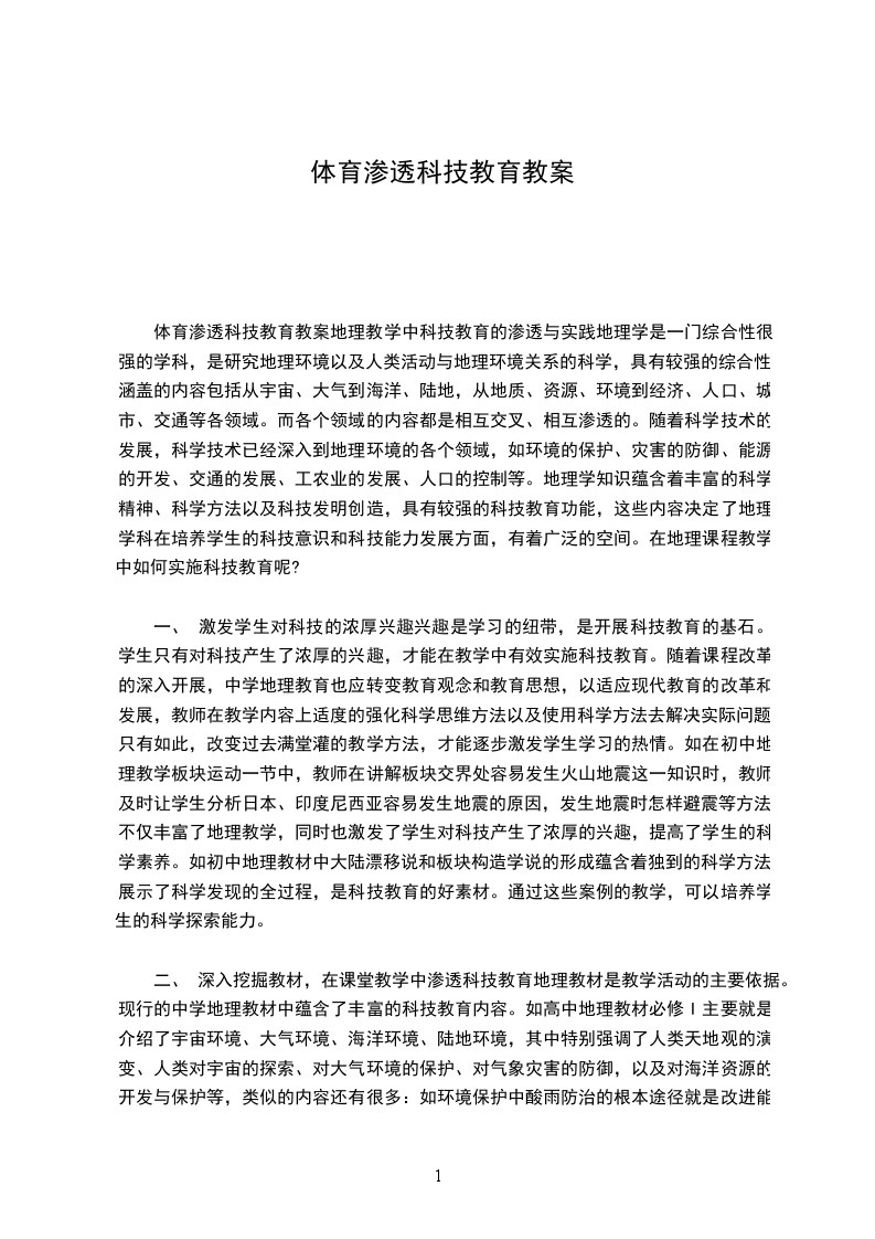 体育渗透科技教育教案地理教学中科技教育的渗透与实践地理学是一门综合性很强的学科,是研究地理环境以及人类活动与地理环境关系的科学,具有较强的综合性,涵盖的内容包括从宇宙、大气到海洋、陆地,从地质、资源、环境到经济、人口、城市、交通等各领域。而各个领域的内容都是相互交叉、相互渗透的。随着科学技术的发展,科学技术已经深入到地理环境的各个领域,如环境的保护、灾害的防御、能源的开发、交通的发展、工农业的发展、人口的控制等。地理学知识蕴含着丰富的科学精神、科学方法以及科技发明创造,具有较强的科技教育功能,这些内容决定了地理学科在培养学生的科技意识和科技能力发展方面,有着广泛的空间。在地理课程教学中如何实施科技教育呢?