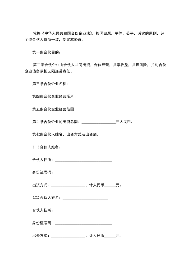 第六条合伙企业的出资总额:__________________元人民币。