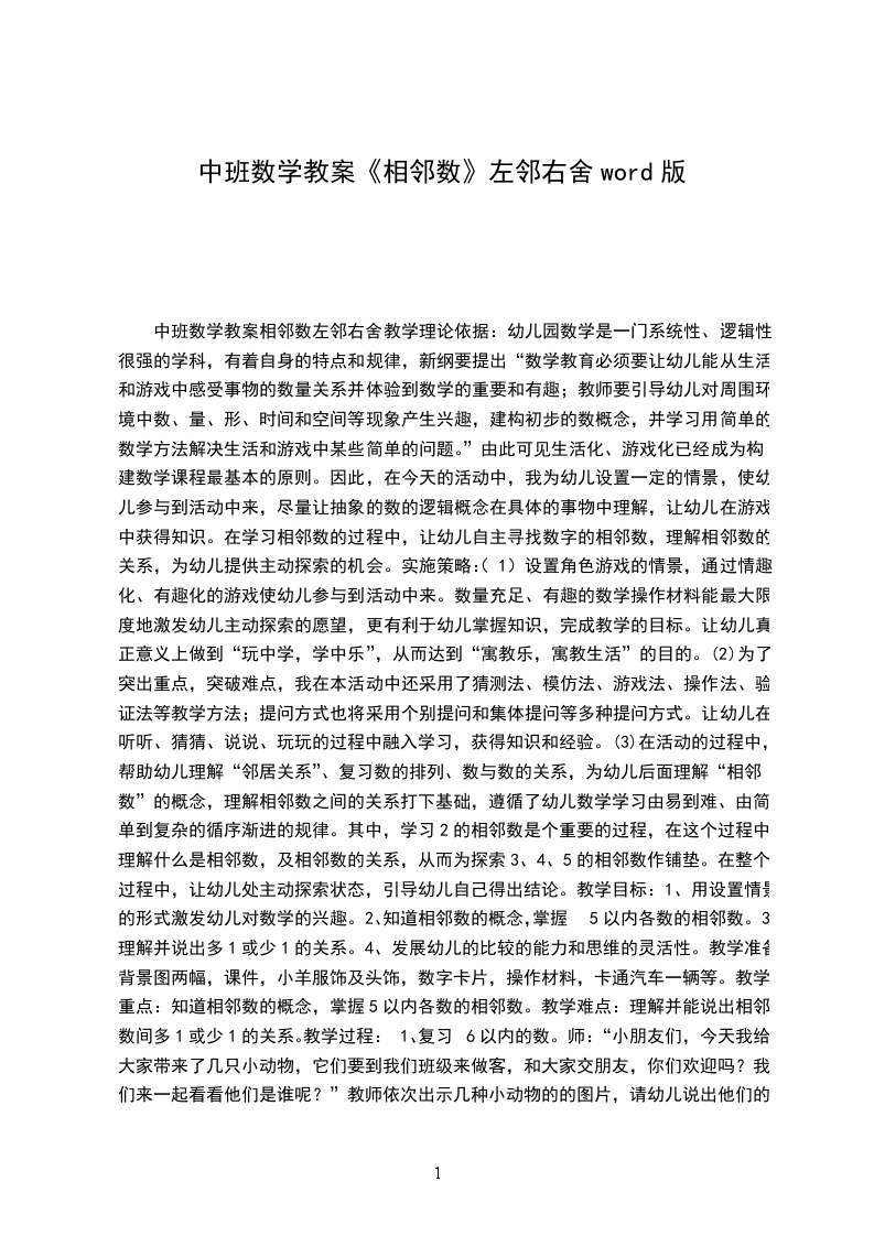 五、 幼儿操作活动。填印数字。请幼儿观察鸽子里的数字和点子,在空缺处印上相应的数字或画圆点。找邻居。观察上牌图片中青蛙的数量,在下排图片中找出邻居并连线。这次活动,整个教学过程都是游戏。幼儿在玩的过程中学习了知识,掌握了知识,而且这一课学习的知识在课后观察中我发现他们掌握得特别好。虽然因个体差异有的幼儿不能脱口而出某一数字的相邻数,但一定会说出那一节课的学习过程,然后慢慢找出答案。活动反思:本课的重点应该是先学会找相邻数,然后再认识相邻属于本数的关系,幼儿接受起来也就更加容易。可是怎样引出相邻数这一概念呢?我用了幼儿易理解“挨着”这一词来向幼儿介绍出相邻数。首先请5名幼儿带着数字头饰按顺序排成一排站在大家面前,然后请下面的幼儿说说5个数字宝宝互相之间谁挨着谁,并一一指出来,孩子都能说出数字宝宝1挨着数字宝宝2,数字2又挨着“1”和“3”.虽然台上没有数字“6”,可是幼儿能够说出5挨着“4”和“6”,就这样这一课的重点就迎刃而解了,对于认识相邻数与本数的关系在一节课中无法得到更深入的学习。第3篇、中班数学活动教案:相邻数教案活动目标: