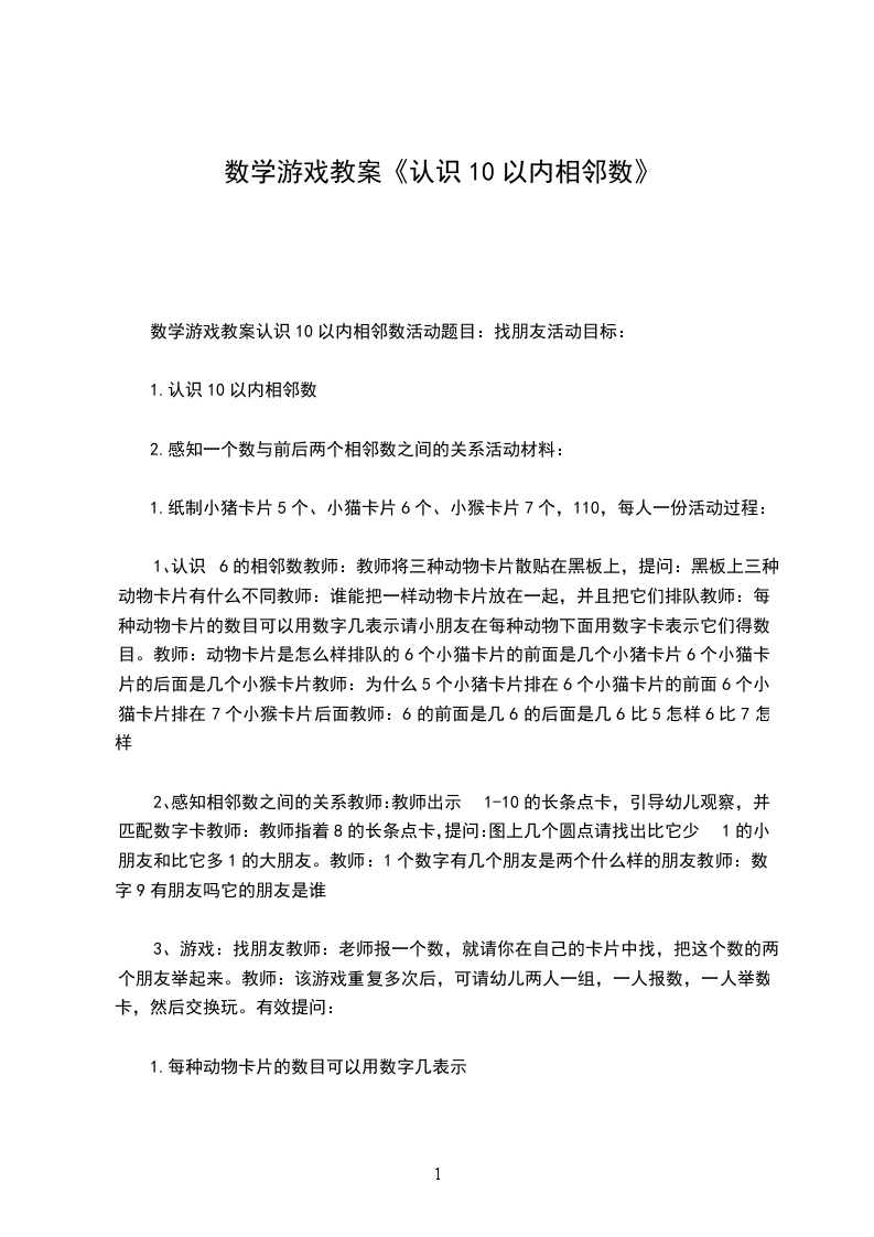 2、教学难点:理解并能说出相邻数间多1或少1的关系。教学方法与手段:情景设置法、游戏法、操作法。教学过程: