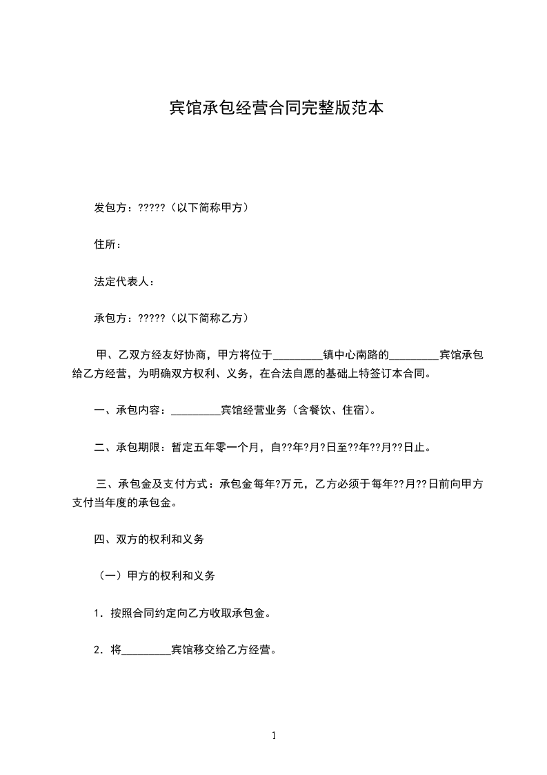 甲、乙双方经友好协商,甲方将位于_________镇中心南路的_________宾馆承包给乙方经营,为明确双方权利、义务,在合法自愿的基础上特签订本合同。