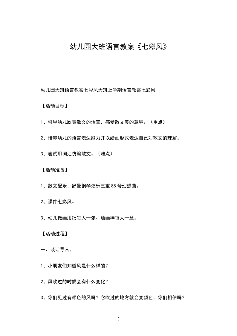 幼儿园大班语言教案七彩风大班上学期语言教案七彩风