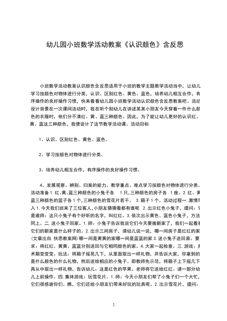 4、发展观察、辨别、归案的能力。教学重点、难点学习按颜色对物体进行分类。活动准备1.红、黄、蓝三种颜色的小兔子各1只,三种颜色的房子各1座。2.红、黄、蓝三种颜色的篮子各1个,三种颜色的雪花片若干。3.箱子1个。活动过程一.激情导入1.今天我们班来了三位客人,小朋友猜猜看都有谁呢2.出示红色小兔子,提问:它是谁师:这只小兔子有个好听的名字,叫红红。3.依次出示黄色、蓝色小兔子,方法同上。二.送小兔子回家。1.师:小兔子告诉我说它们今天要搬新家了,我们一起看看它们的新家是什么样子的。2.出示三间房子,请幼儿说一说,哪一间房子是红红的家(文章出自.快思教案网)哪一间是黄黄的家哪一间是蓝蓝的家3.送小兔子送回家。要求:将红红、黄黄、蓝蓝分别送回与它相同颜色的家。4.大家一起检查。三.游戏:魔术箱变变变。玩法:将箱子摇晃几下,从里面取出一样礼物,并告诉大家,你拿到的是什么颜色的什么礼物,然后送给相应的小兔子。即教师先示范,将箱子上下摇几下,再从中取出一样礼物,告诉幼儿:这是红色的苹果。老师将它送给红红。请一部分幼儿上前操作。四.集体游戏:玩雪花片。1.师:今天小朋友们帮了小兔子们一个大忙,它们很感谢你们。瞧,它们还给小朋友们带来好玩的玩具呢。2.出示雪花片,提问:这是什么都有什么颜色(红、黄、蓝)3.幼儿自由玩玩具,老师巡视,并提问个别幼儿:“你拿到了什么颜色的雪花片”4.将玩具送回家。