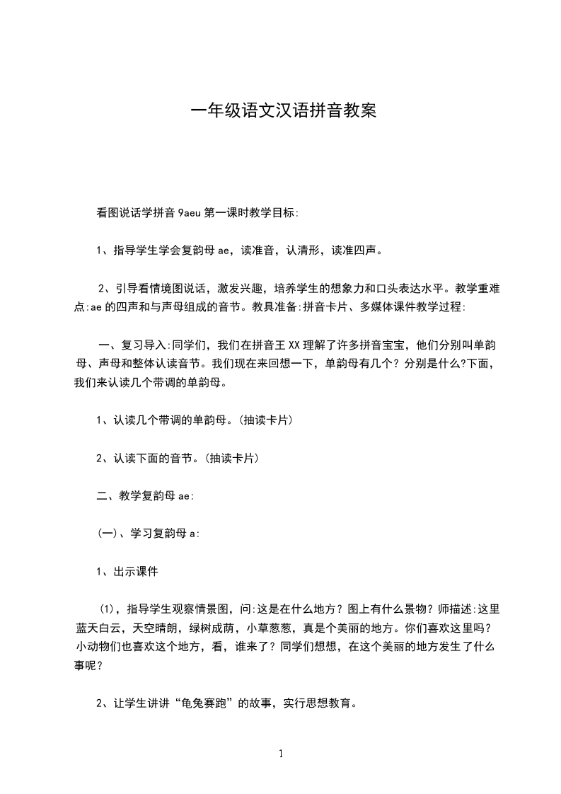 2、引导看情境图说话,激发兴趣,培养学生的想象力和口头表达水平。教学重难点:ae的四声和与声母组成的音节。教具准备:拼音卡片、多媒体课件教学过程: