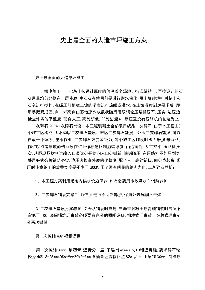 二、组织施工工人进场,熟悉现场环境,进行施工前的进场教育,要求工人须遵守学校治理的有关规章制度.草坪辅置时要按下面的步骤进行:i.对现场人造草坪进行分类清理工作.ii.清扫场地,按图纸要求在场地上划线,基准线要仔细复核.iii.检查场地与留空位置是否放置到位.iv.先铺设内场草坪,再铺设外围草坪.v.先把成卷的人造草坪放开,伸直拉平、摆正,然后再放底布.底布放到位后,再轻轻翻开刷胶、粘接.接缝处的刷胶宽度不得小于100mm连成整体后,再放标志线.vi.人造草坪潮湿时,不得进行粘接作业,需要翻开、晒干后,方可进行粘接.vii.每天上午上班要对昨天的作业情况进行检查,发现枇点,立即整改,保证无质量问题后再进行下道工序.viii.人造草坪铺好后,再进行积分分割法的新工艺充砂,需均匀摊铺,从外圈往里圈走,每圈要重叠300mm充砂完毕后加充橡胶颗粒.B人造草坪施工工艺