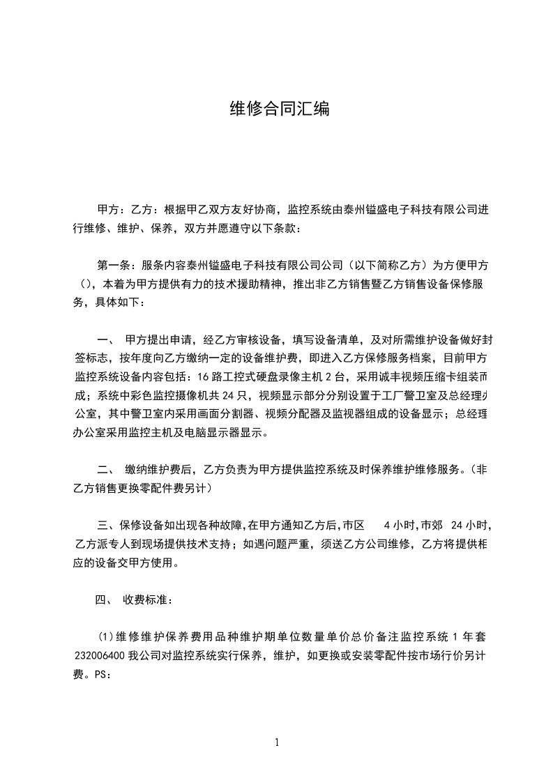 甲方:乙方:根据甲乙双方友好协商,监控系统由泰州镒盛电子科技有限公司进行维修、维护、保养,双方并愿遵守以下条款: