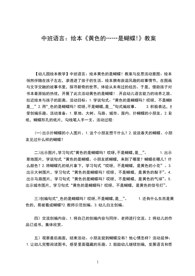 【幼儿园绘本教学】中班语言:绘本黄色的是蝴蝶!教案与反思活动意图:绘本悄然伴随在孩子左右,渗透进了孩子的生活。绘本拥有诙谐风趣的故事情节,在图画与文字交融的故事书里,探寻新奇的世界,体验从未有过的经历。于是,借助孩子对书本最原始的热忱,开展了此次活动黄色的是蝴蝶!.开启幼儿语言能力的培养之旅。拉近绘本与孩子的距离。活动目标:1.学说句式:“黄色的是蝴蝶吗?哎呀,不是蝴蝶,是__”2.用“_色的是蝴蝶吗?哎呀,不是蝴蝶,是__”句式编故事。3.积极表达,感受创编乐趣。活动准备:1.草地、大树、马路、城市、屋内、扑蝴蝶的小朋友。2.彩纸,蝴蝶形孔的纸片,勾线笔人手一支。活动过程: