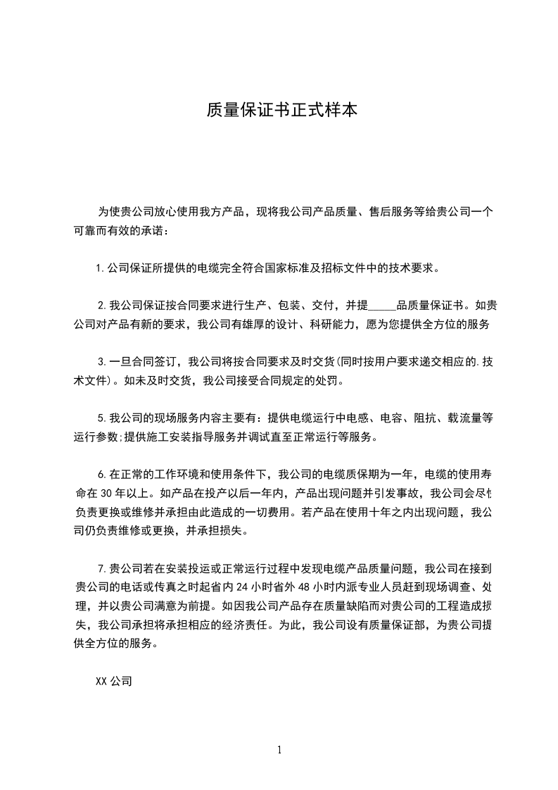 6.在正常的工作环境和使用条件下,我公司的电缆质保期为一年,电缆的使用寿命在30年以上。如产品在投产以后一年内,产品出现问题并引发事故,我公司会尽快负责更换或维修并承担由此造成的一切费用。若产品在使用十年之内出现问题,我公司仍负责维修或更换,并承担损失。