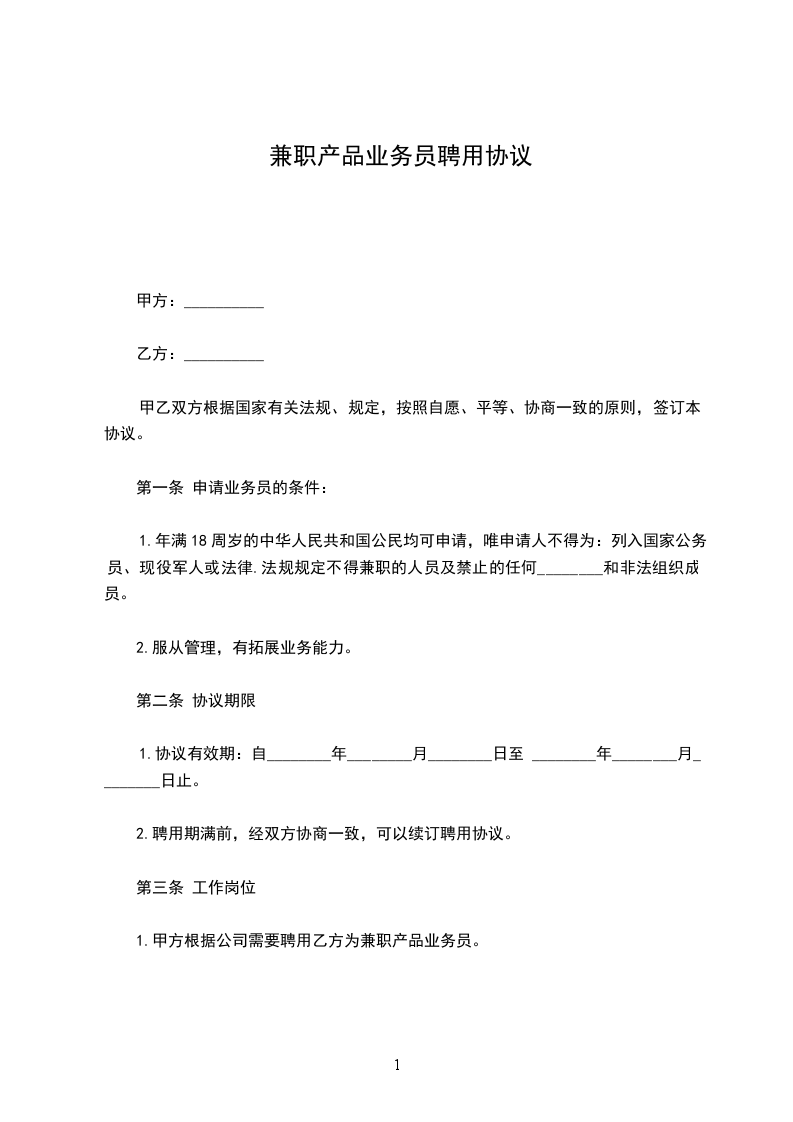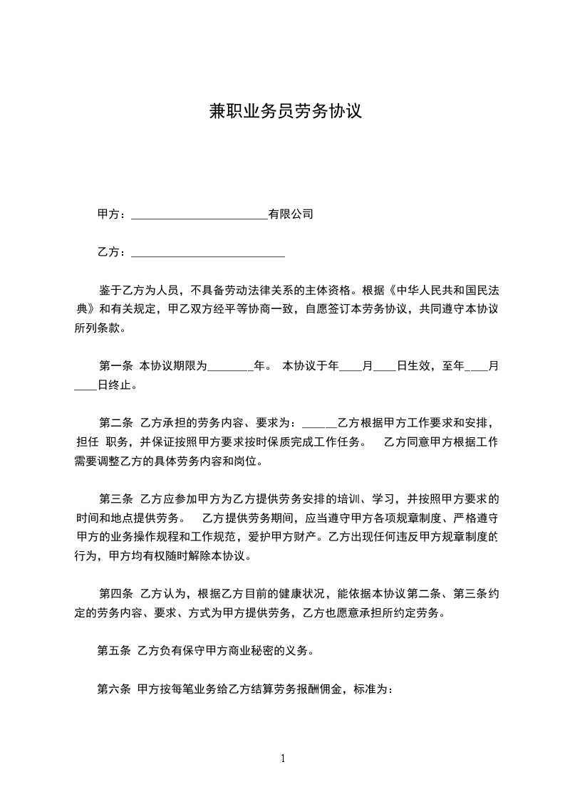 甲方:乙方:本着“真诚合作、平等自愿”的原则,经双方协商,甲方邀请乙方为兼职业务员,负责甲方、门店的产品市场和销售,为保障甲乙双方的合法权益,特制定协议如下: