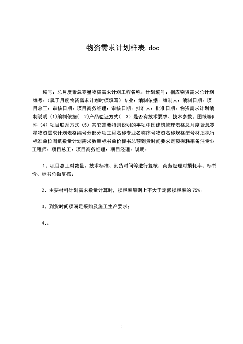 编号:总月度紧急零星物资需求计划工程名称:计划编号:相应物资需求总计划编号:(属于月度物资需求计划时须填写)专业:编制依据:编制人:编制日期:项目总工:审核日期:项目商务经理:审核日期:批准人:批准日期:物资需求计划编制说明(1)编制依据(2)产品验证方式(3)是否有技术要求、技术参数、图纸等附件(4)项目联系方式(5)其它需要特别说明的事项中国建筑管理表格总月度紧急零星物资需求计划表格编号分部分项工程名称专业名称序号物资名称规格型号材质执行标准单位图纸数量计划需求数量标书单价标书总额到货时间要求定额损耗率备注专业工程师:项目总工:项目商务经理:项目经理:说明: