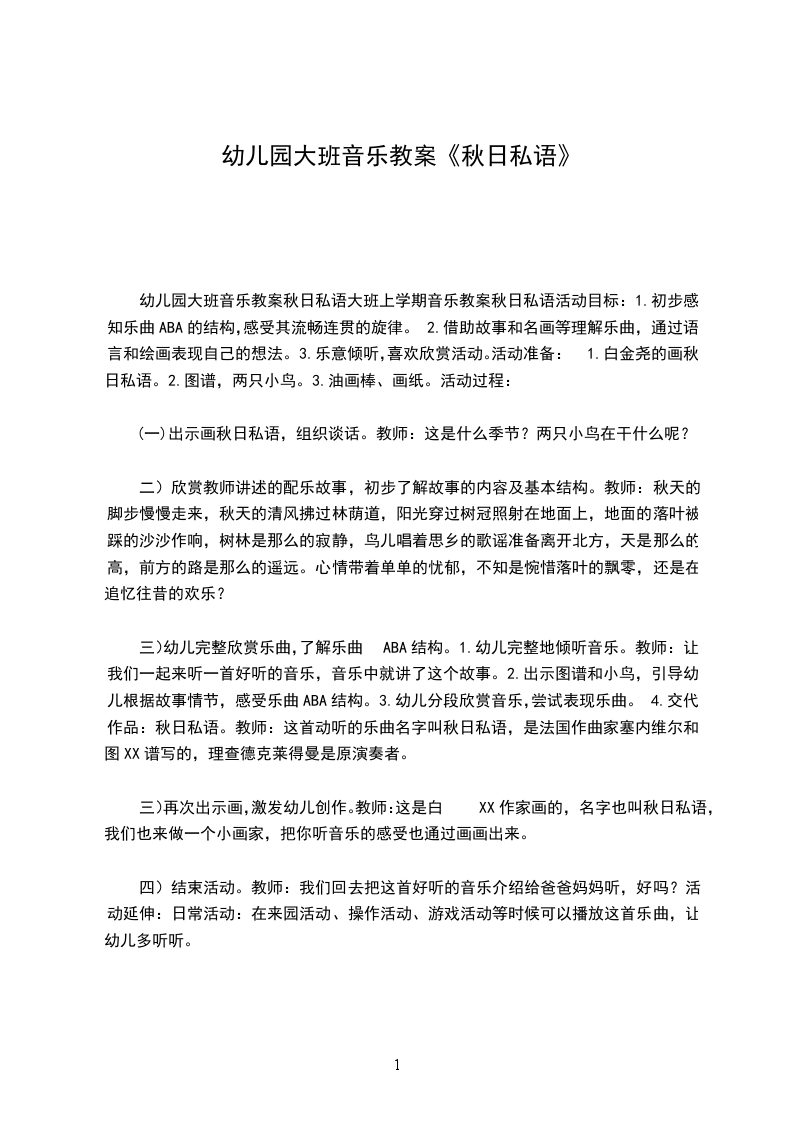 幼儿园大班音乐教案秋日私语大班上学期音乐教案秋日私语活动目标:1.初步感知乐曲ABA的结构,感受其流畅连贯的旋律。2.借助故事和名画等理解乐曲,通过语言和绘画表现自己的想法。3.乐意倾听,喜欢欣赏活动。活动准备:1.白金尧的画秋日私语。2.图谱,两只小鸟。3.油画棒、画纸。活动过程: