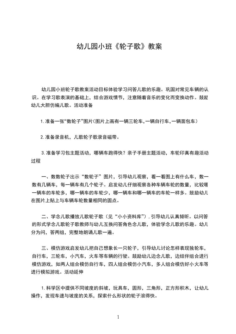 1、看图数一数轮子的数量。师:“今天来了好多的小动物,他们都开着自己的车来了,我们来看看他们都开了什么车吧。”师:“这个是谁呀?”(小白兔)。师:“小兔子开了什么车呀?”(一个轮子的车)。师:“小兔子开来了独轮车。数数看小兔子的车有几个轮子呀?”(一个)。师:“小兔子开了一个轮子的独轮车。”