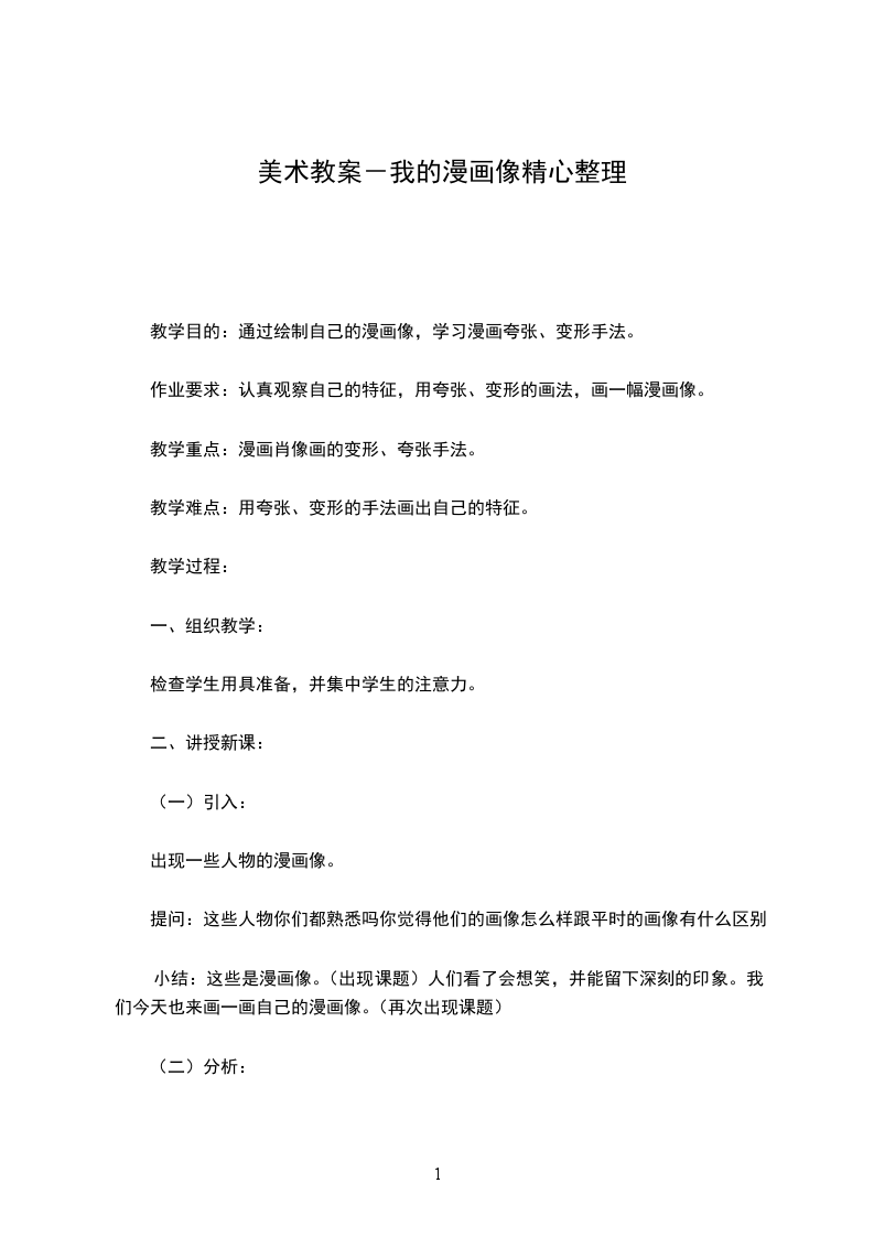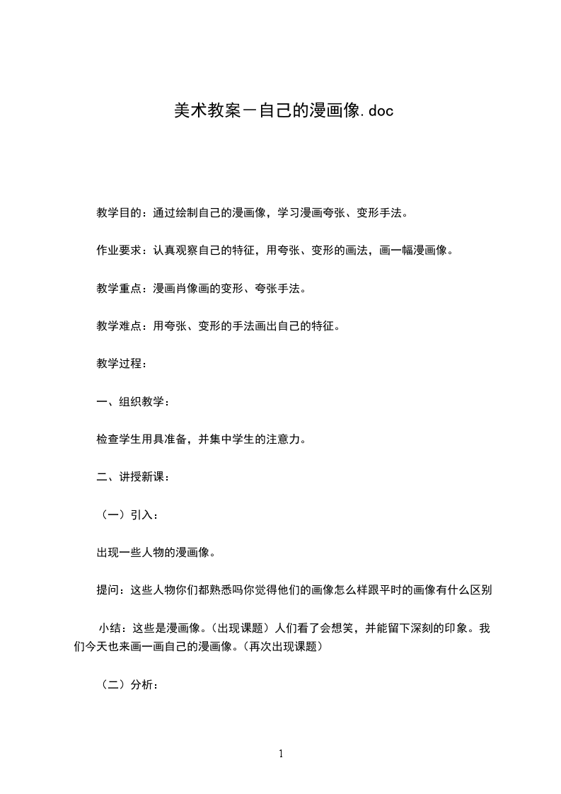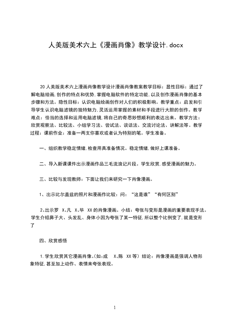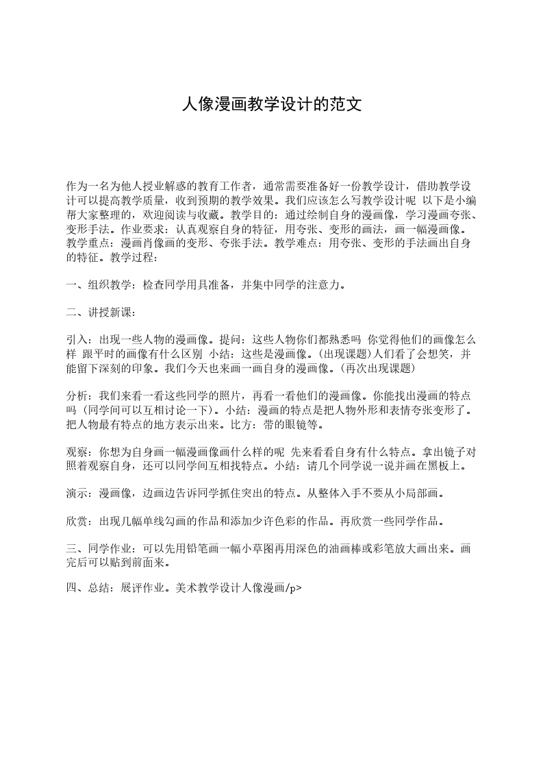 作为一名为他人授业解惑的教育工作者,通常需要准备好一份教学设计,借助教学设计可以提高教学质量,收到预期的教学效果。我们应该怎么写教学设计呢 以下是小编帮大家整理的,欢迎阅读与收藏。教学目的:通过绘制自身的漫画像,学习漫画夸张、变形手法。作业要求:认真观察自身的特征,用夸张、变形的画法,画一幅漫画像。教学重点:漫画肖像画的变形、夸张手法。教学难点:用夸张、变形的手法画出自身的特征。教学过程: