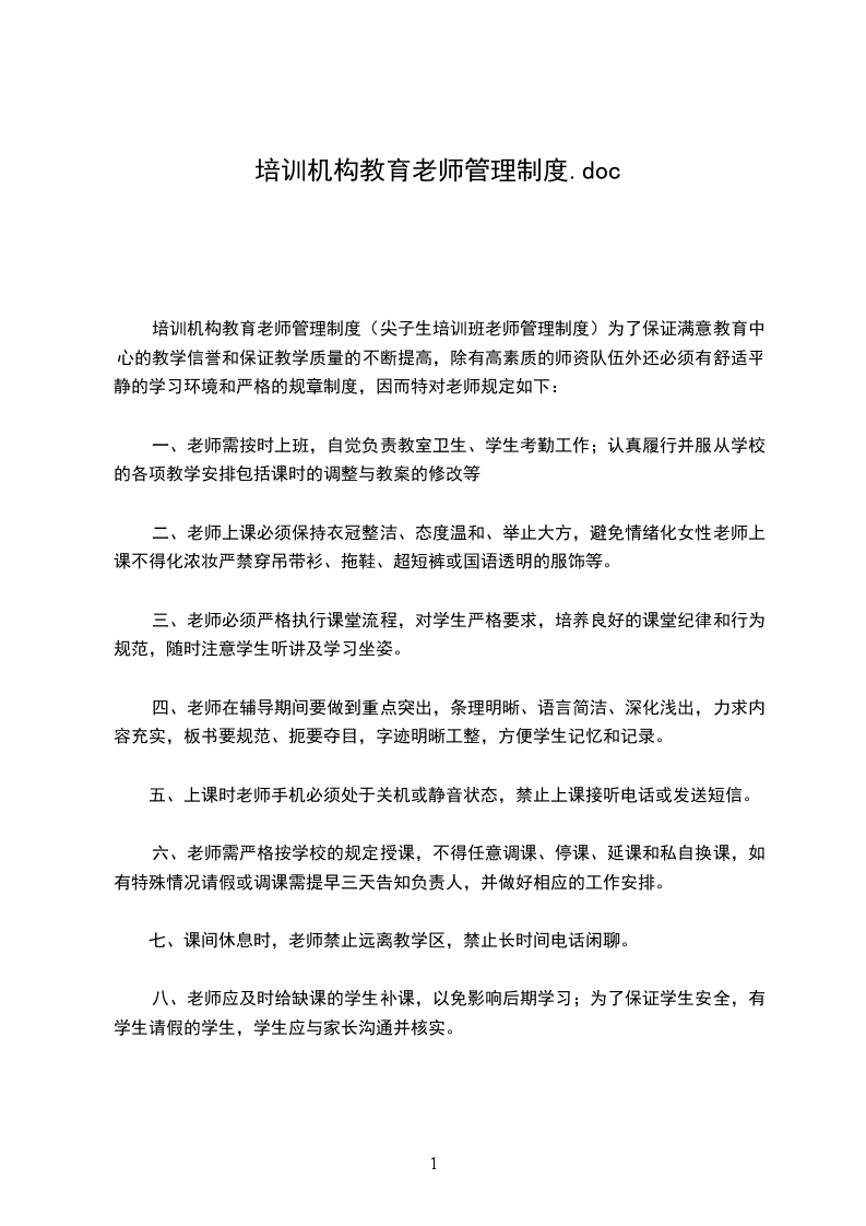培训机构教育老师管理制度(尖子生培训班老师管理制度)为了保证满意教育中心的教学信誉和保证教学质量的不断提高,除有高素质的师资队伍外还必须有舒适平静的学习环境和严格的规章制度,因而特对老师规定如下:
