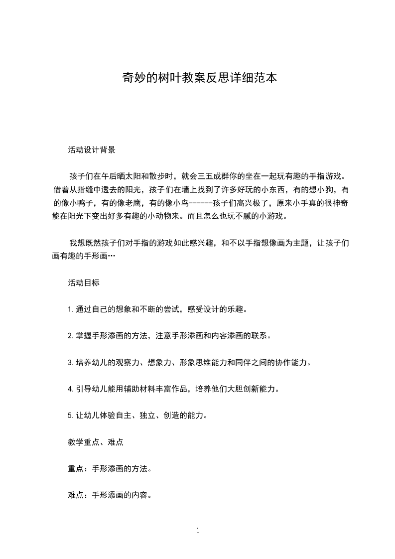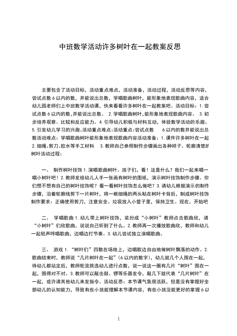 主要包含了活动目标,活动重点难点,活动准备,活动过程,活动反思等内容,尝试点数6以内的数,并能说出总数,学唱歌曲树叶,能形象地表现歌曲内容,适合幼儿园老师们上中班数学活动课,快来看看许多树叶在一起教案吧。活动目标:1.尝试点数6以内的数,并能说出总数。2.学唱歌曲树叶,能形象地表现歌曲内容。3.初步培养观察、比较和反应能力。4.引导幼儿积极与材料互动,体验数学活动的乐趣。5.引发幼儿学习的兴趣。活动重点难点:活动重点:尝试点数6以内的数并能说出总数活动难点:学唱歌曲树叶能形象地表现歌曲内容活动准备:1.课件许多树叶在一起2.细绳、剪刀、胶水等手工材料3.教师自己参照制作步骤画出各种样子、轮廓清楚的树叶活动过程: