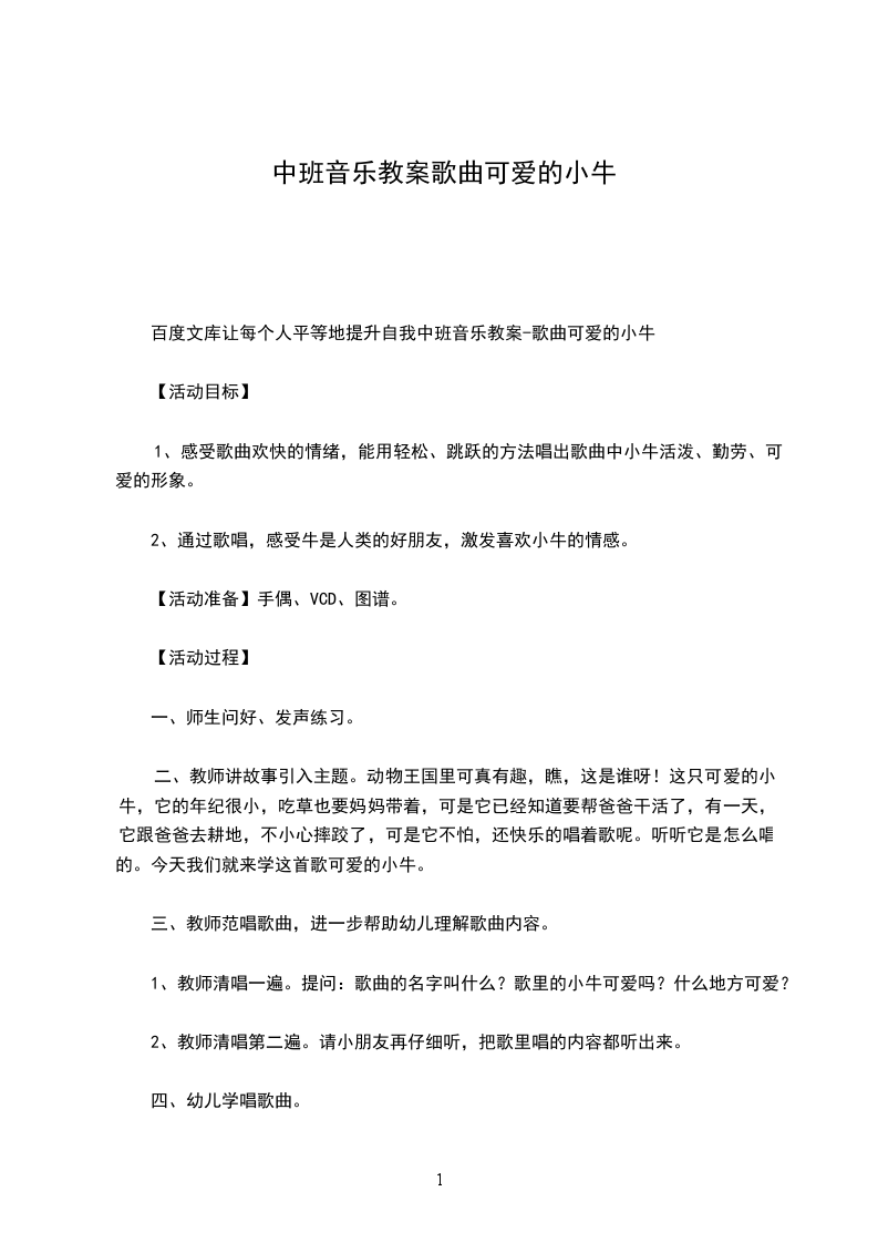 百度文库让每个人平等地提升自我中班音乐教案-歌曲可爱的小牛