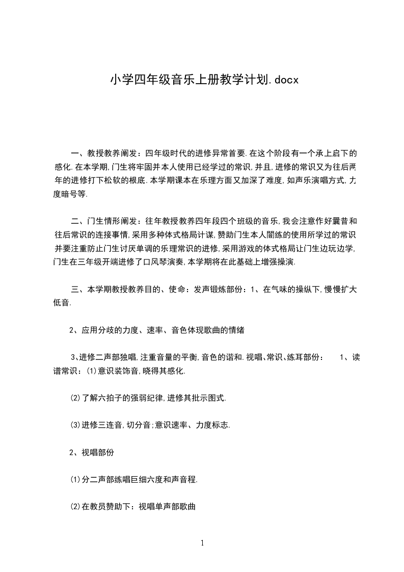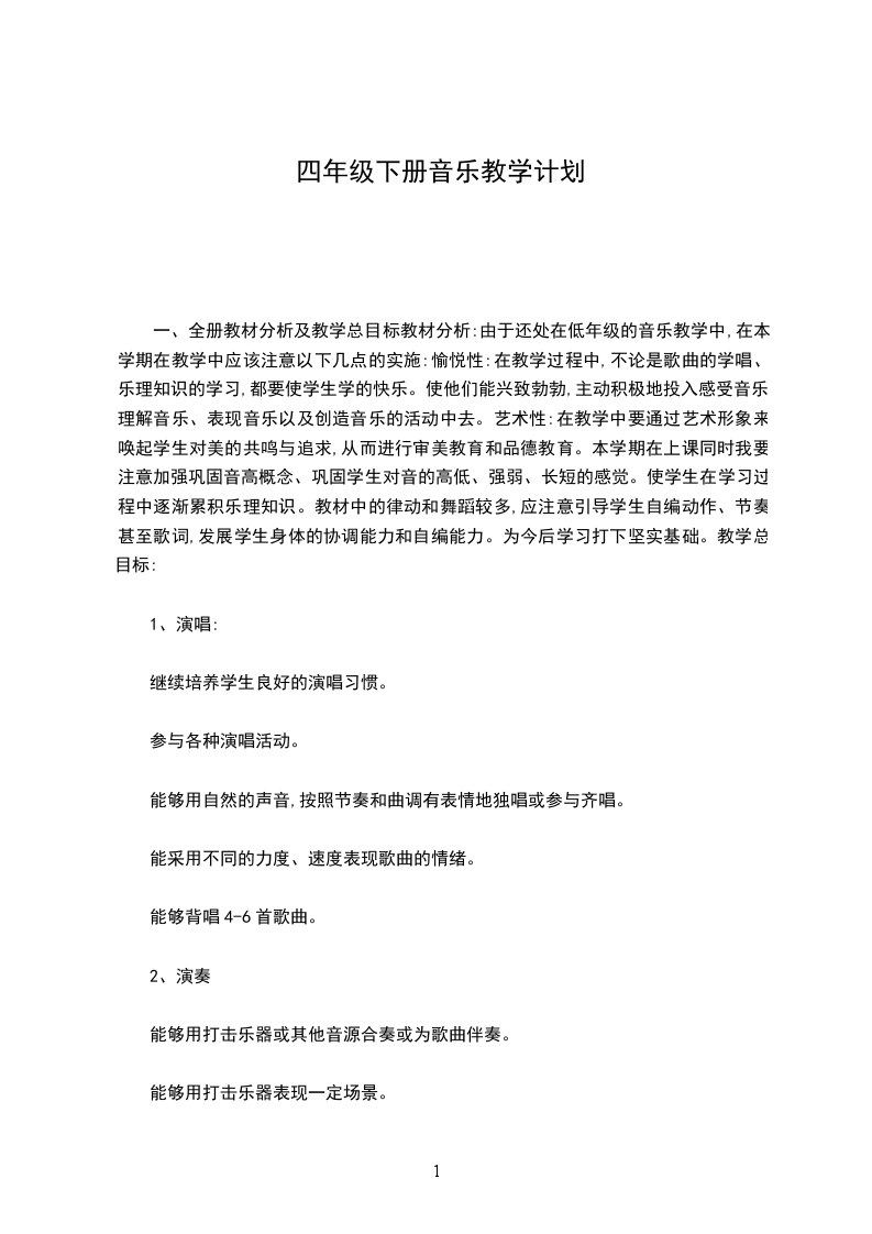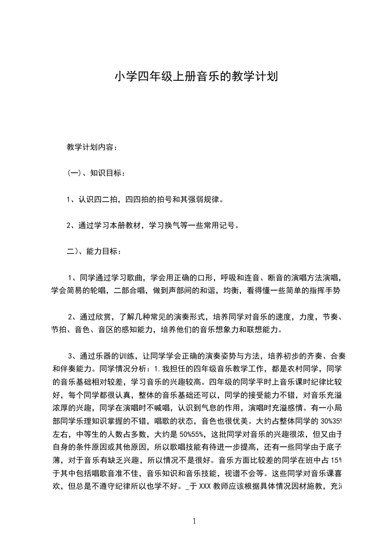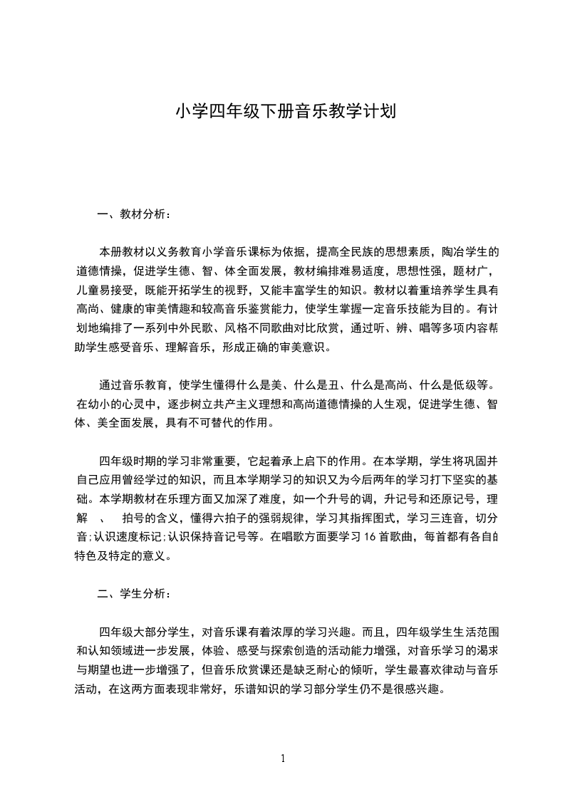 3、通过乐器的训练,让同学学会正确的演奏姿势与方法,培养初步的齐奏、合奏和伴奏能力。同学情况分析:1.我担任的四年级音乐教学工作,都是农村同学,同学的音乐基础相对较差,学习音乐的兴趣较高。四年级的同学平时上音乐课时纪律比较好,每个同学都很认真,整体的音乐基础还可以,同学的接受能力不错,对音乐充溢浓厚的兴趣,同学在演唱时不喊唱,认识到气息的作用,演唱时充溢感情。有一小局部同学乐理知识掌握的不错,唱歌的状态,音色也很优美。大约占整体同学的30%35%左右,中等生的人数占多数,大约是50%55%,这批同学对音乐的兴趣很浓,但又由于自身的条件原因或其他原因,所以歌唱技能有待进一步提高,还有一些同学由于底子薄,对于音乐有缺乏兴趣,所以情况不是很好。音乐方面比较差的同学在班中占15%于其中包括唱歌音准不佳,音乐知识和音乐技能,视谱不会等。这些同学对音乐课喜欢,但总是不遵守纪律所以也学不好。_于XXX教师应该根据具体情况因材施教,充沛激发这些同学学习音乐,喜好音乐的兴趣,对他们要多鼓励多表示,寻找他们身上的闪光点,培养他们的感情。教材分析: