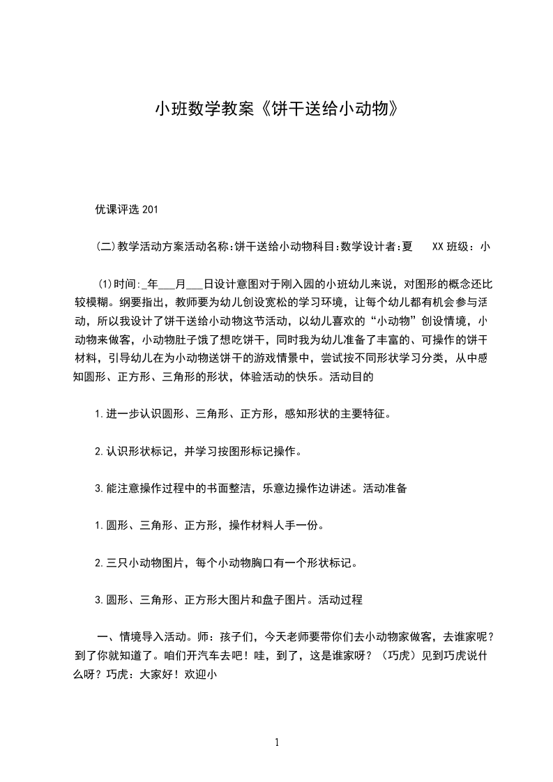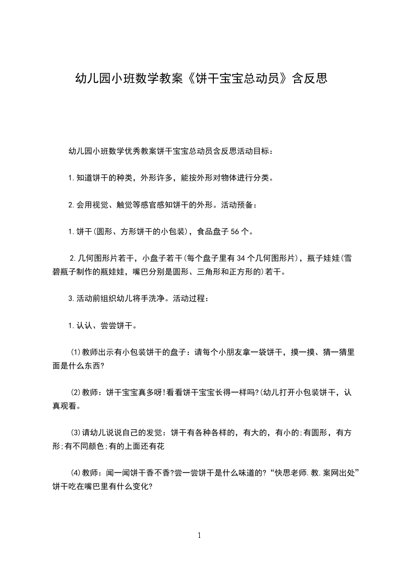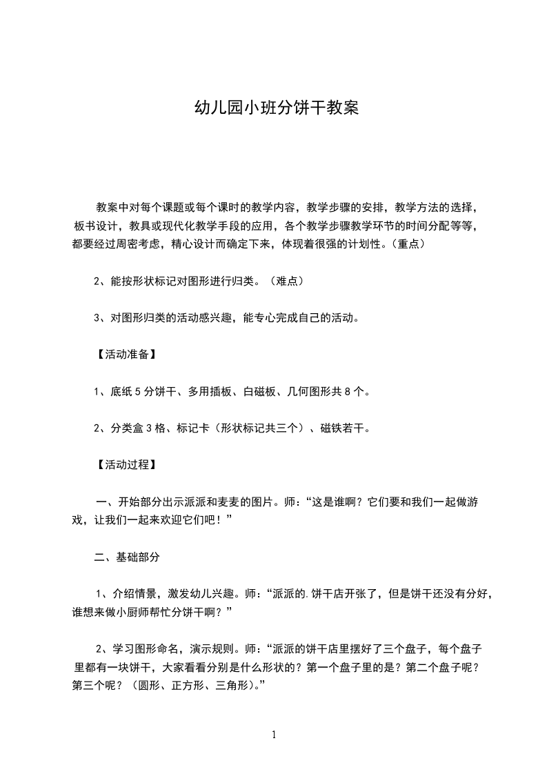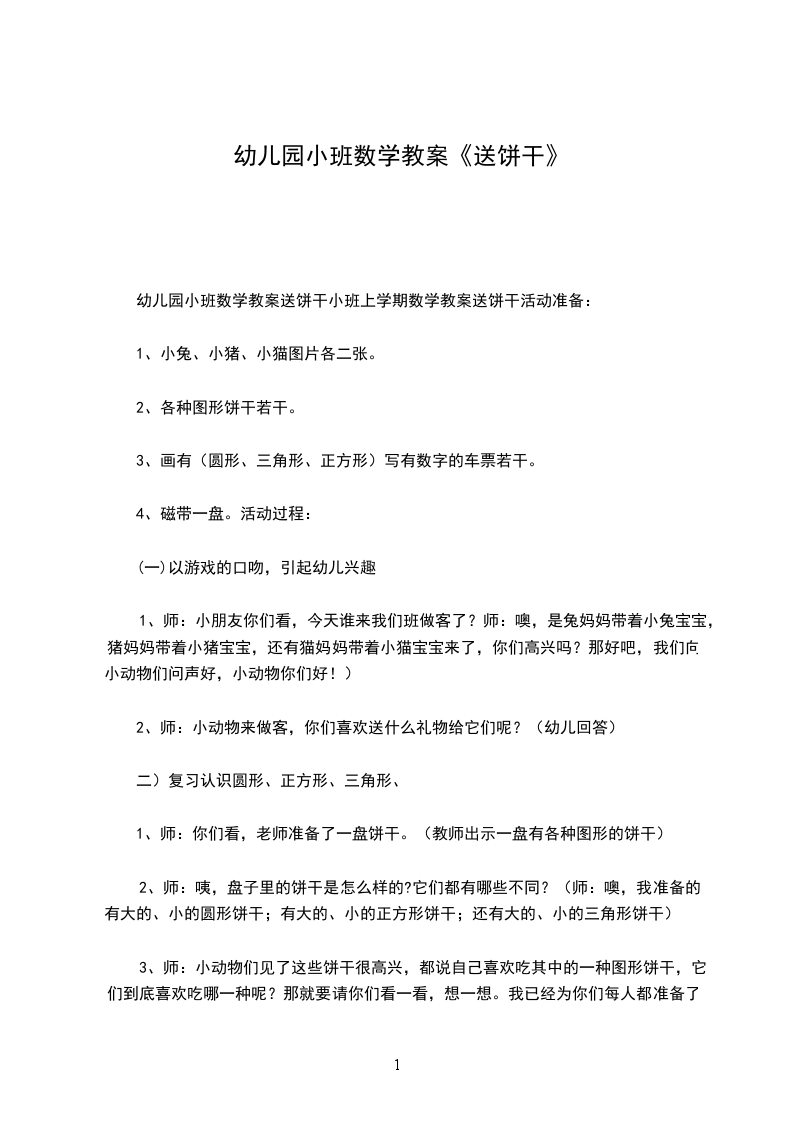 幼儿园小班数学教案送饼干小班上学期数学教案送饼干活动准备: