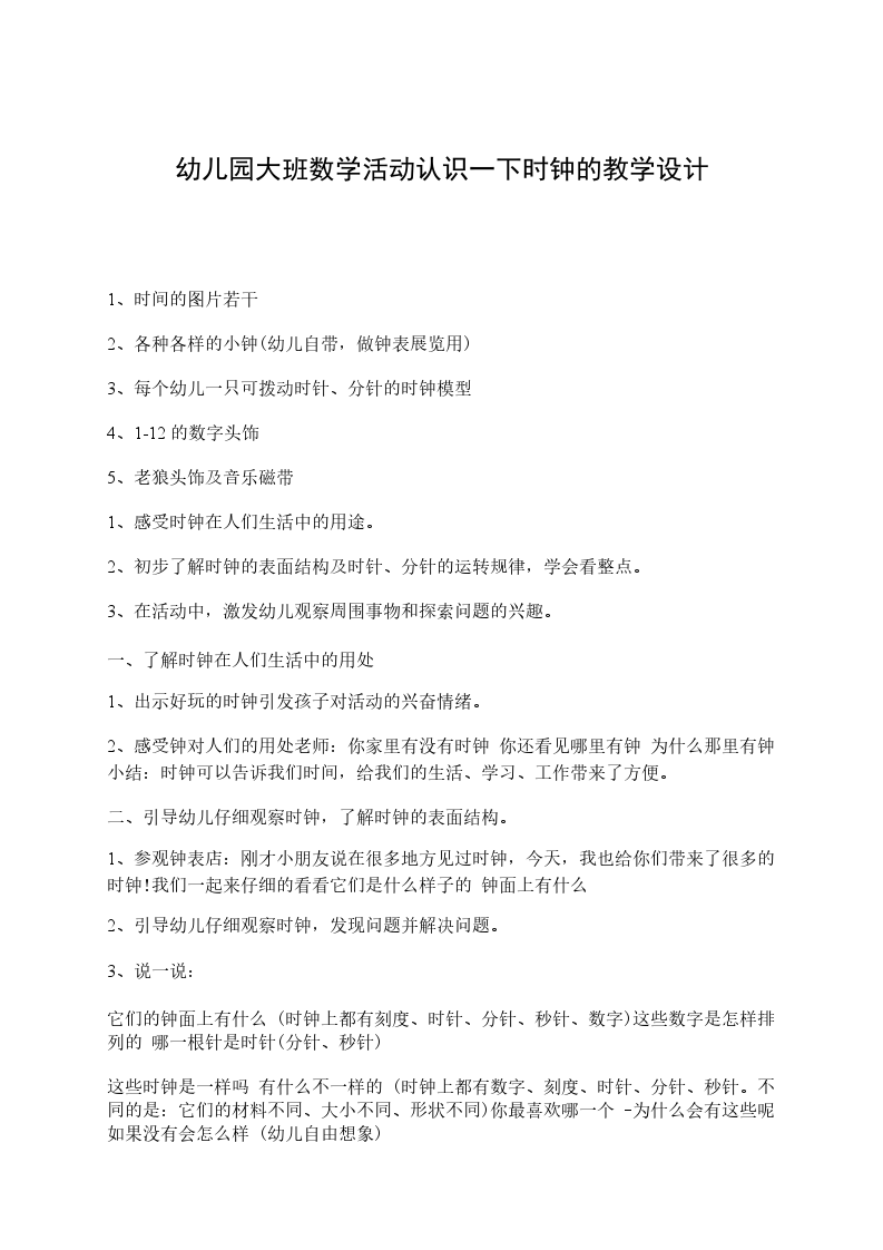 这些时钟是一样吗 有什么不一样的 (时钟上都有数字、刻度、时针、分针、秒针。不同的是:它们的材料不同、大小不同、形状不同)你最喜欢哪一个 -为什么会有这些呢 如果没有会怎么样 (幼儿自由想象)