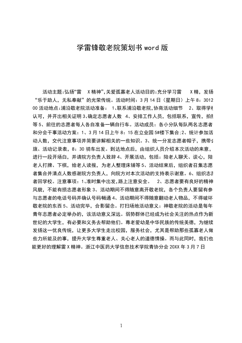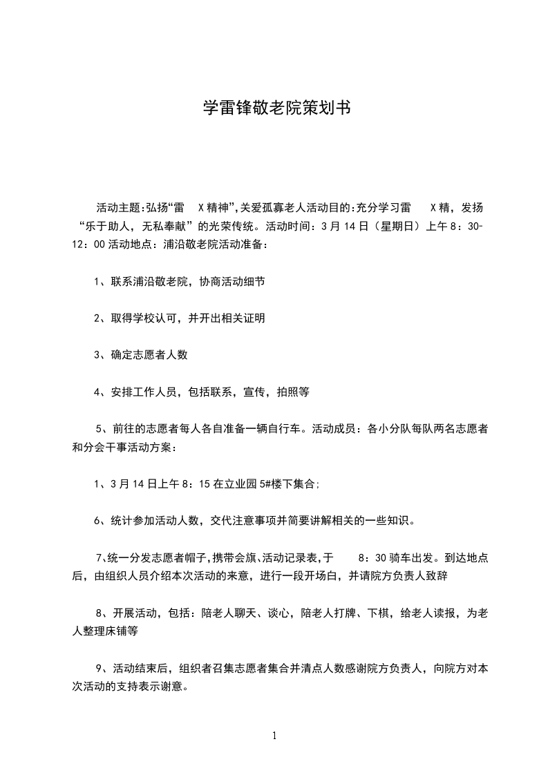 活动主题:弘扬“雷X精神”,关爱孤寡老人活动目的:充分学习雷X精,发扬“乐于助人,无私奉献”的光荣传统。活动时间:3月14日(星期日)上午8:30-12:00活动地点:浦沿敬老院活动准备: