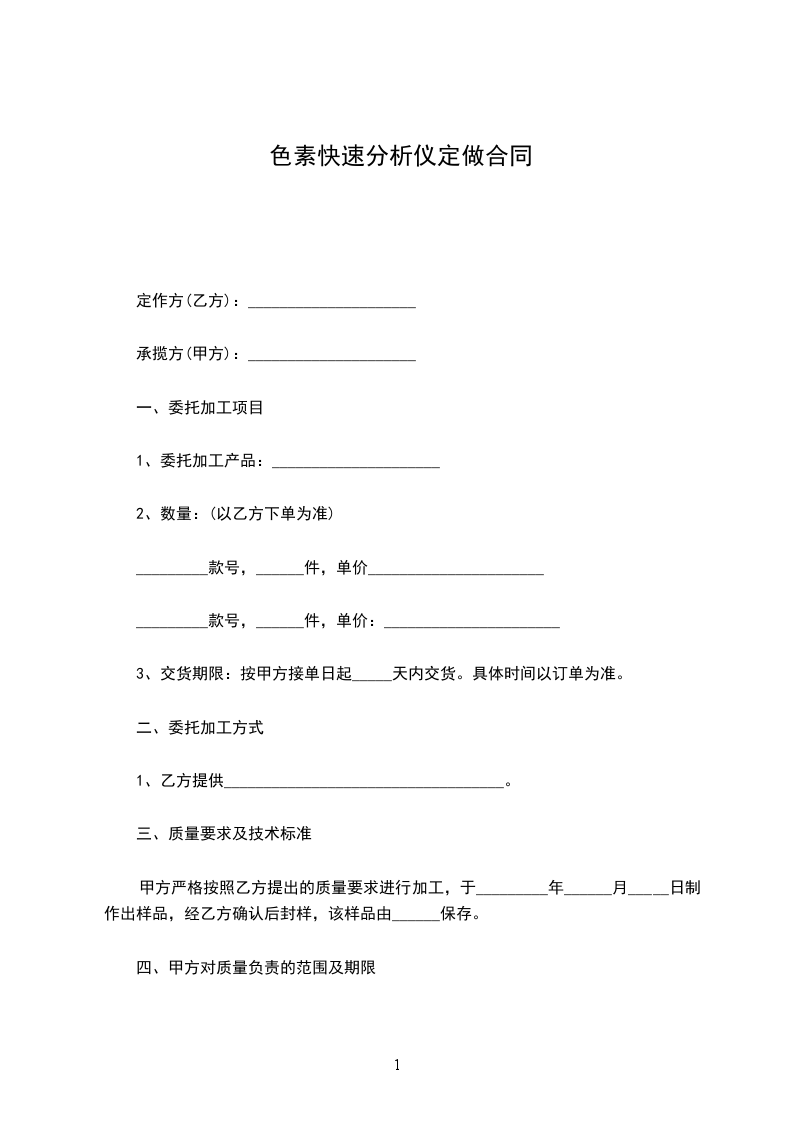 甲方委托乙方为其加工_____________________产品,加工数量、款式(或开发信息)、标准、质量要求由甲方提供,价格由双方协商确定。