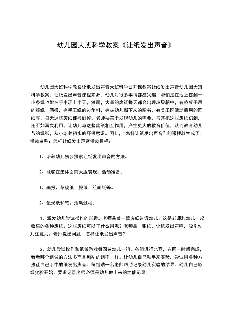 幼儿园大班科学教案让纸发出声音大班科学公开课教案让纸发出声音幼儿园大班科学教案:让纸发出声音课程来源:幼儿对很多事情都感兴趣,哪怕是在地上拣到一小条纸也能在手中玩上半天,然而,大量的废纸每天都会出现垃圾箱中,有垫桌子用的报纸、画报,有手工纸的边角料,有被幼儿撕下来的图书,有美工区活动后用的画纸等,每天这些废纸都被到掉。老师要善于发现幼儿的需要,与其把这些废纸仍到,还不如再次利用,让幼儿与这些废纸相互作用,产生更大的教育价值,从而教育幼儿节约纸张,从小培养初步的环保意识。因此,“怎样让纸发出声音”的课程就生成了。活动名称:怎样让纸发出声音活动目标: