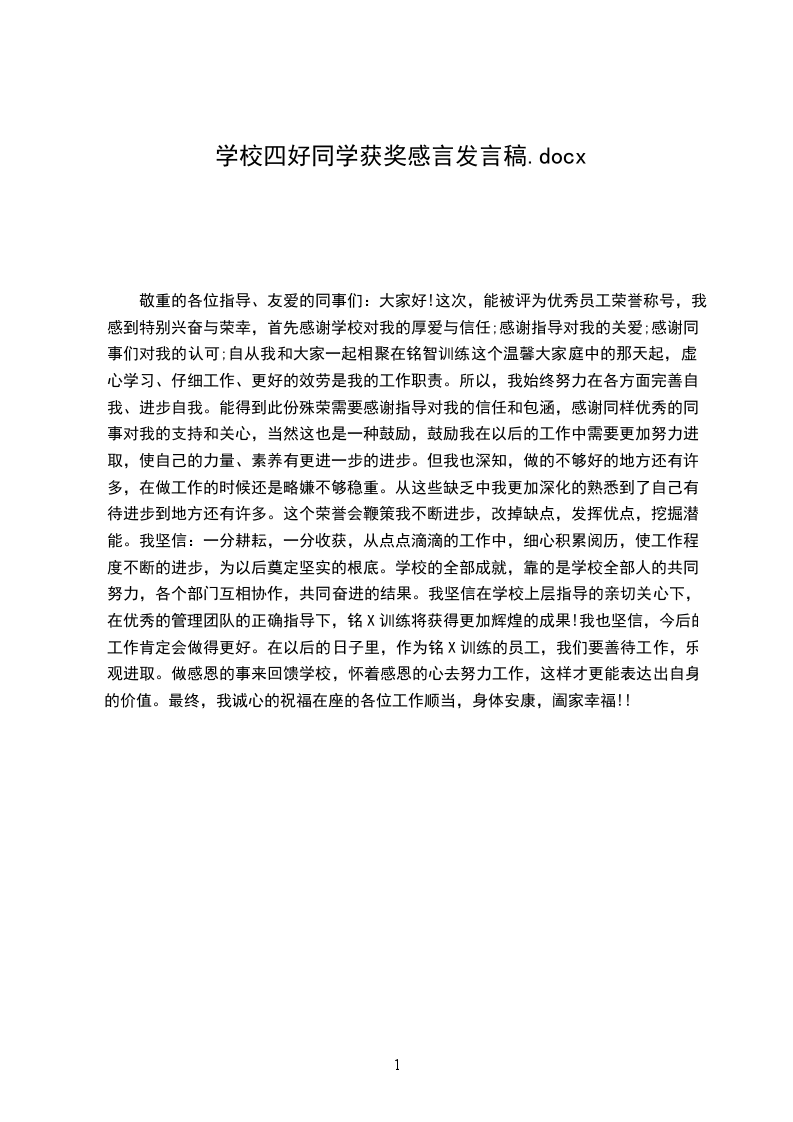 敬重的各位指导、友爱的同事们:大家好!这次,能被评为优秀员工荣誉称号,我感到特别兴奋与荣幸,首先感谢学校对我的厚爱与信任;感谢指导对我的关爱;感谢同事们对我的认可;自从我和大家一起相聚在铭智训练这个温馨大家庭中的那天起,虚心学习、仔细工作、更好的效劳是我的工作职责。所以,我始终努力在各方面完善自我、进步自我。能得到此份殊荣需要感谢指导对我的信任和包涵,感谢同样优秀的同事对我的支持和关心,当然这也是一种鼓励,鼓励我在以后的工作中需要更加努力进取,使自己的力量、素养有更进一步的进步。但我也深知,做的不够好的地方还有许多,在做工作的时候还是略嫌不够稳重。从这些缺乏中我更加深化的熟悉到了自己有待进步到地方还有许多。这个荣誉会鞭策我不断进步,改掉缺点,发挥优点,挖掘潜能。我坚信:一分耕耘,一分收获,从点点滴滴的工作中,细心积累阅历,使工作程度不断的进步,为以后奠定坚实的根底。学校的全部成就,靠的是学校全部人的共同努力,各个部门互相协作,共同奋进的结果。我坚信在学校上层指导的亲切关心下,在优秀的管理团队的正确指导下,铭X训练将获得更加辉煌的成果!我也坚信,今后的工作肯定会做得更好。在以后的日子里,作为铭X训练的员工,我们要善待工作,乐观进取。做感恩的事来回馈学校,怀着感恩的心去努力工作,这样才更能表达出自身的价值。最终,我诚心的祝福在座的各位工作顺当,身体安康,阖家幸福!!