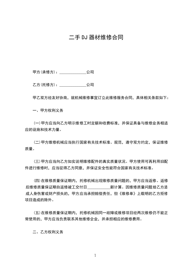 甲乙双方经友好协商,就机械维修事宜订立此维修服务合同,具体相关条款如下: