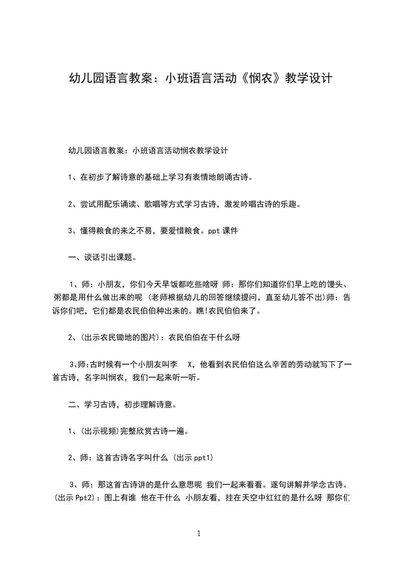 幼儿园语言教案:小班语言活动悯农教学设计