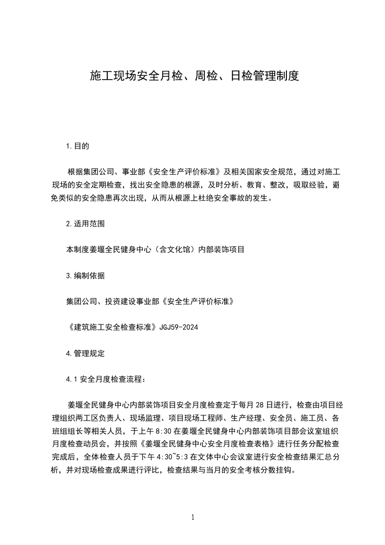 二、安全检查的目的通过安全检查,达到增强广大工人和管理人员的安全意识,促进劳动安全相关政策、规章制度的贯彻落实,做到杜绝死亡重伤事故,一般工伤事故可控,确保施工顺利进行。现场施工安全状况从侧面反映了地产商的现场管理水平,是客户对地产商信心的保证,同时也是企业社会责任的体现。最终目的是让“均好”成为北京公司每一个项目的常态。周安全检查制度